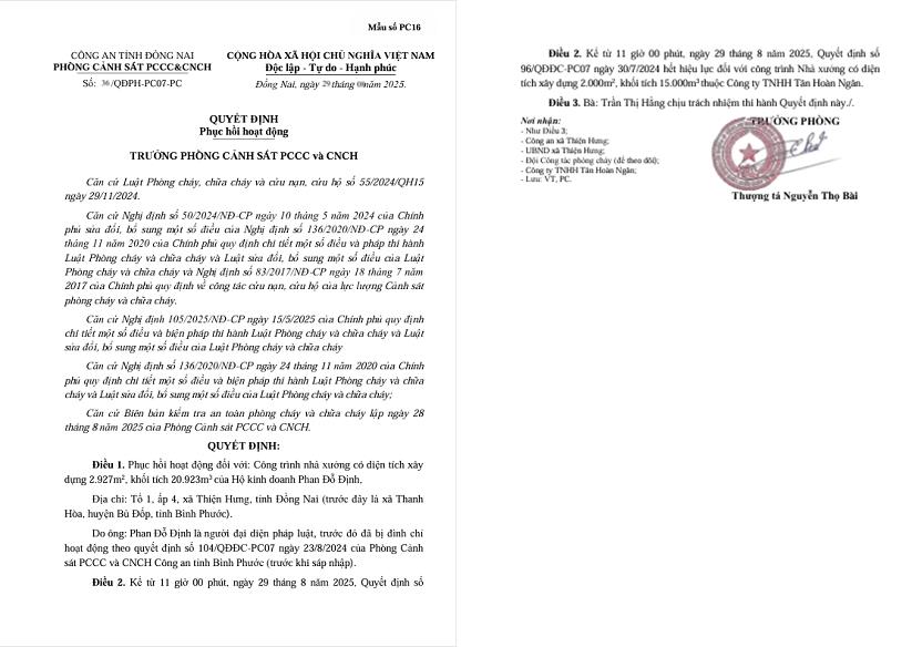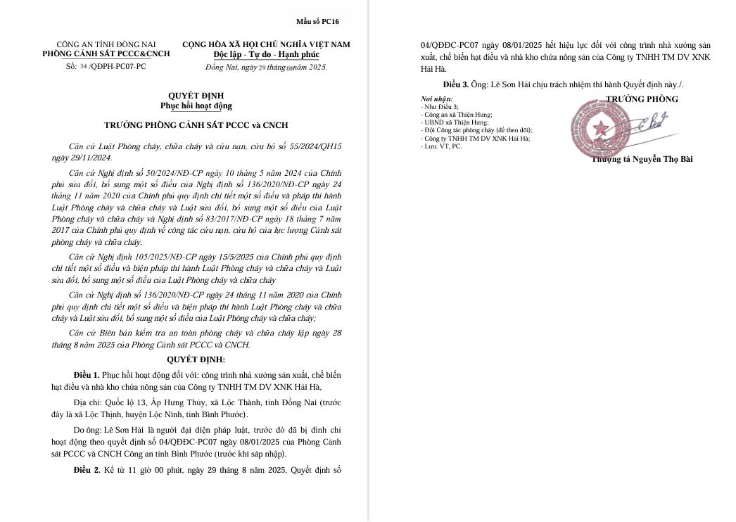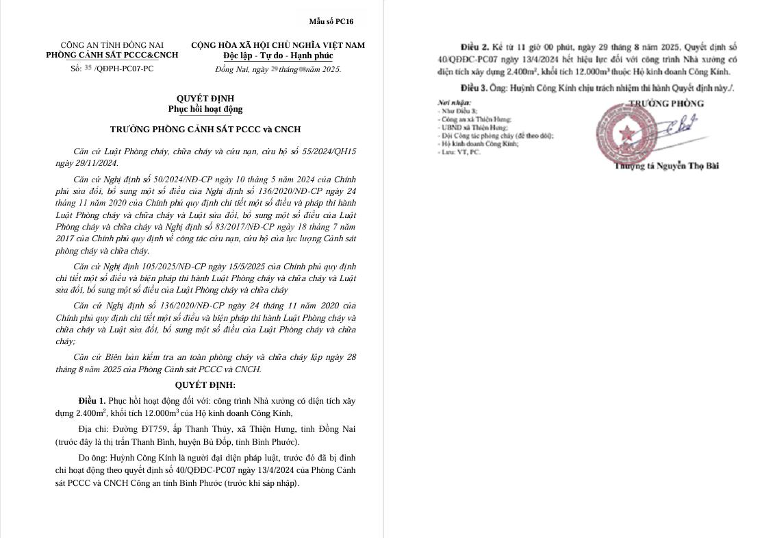 Phòng Cảnh sát PCCC và CNCH đã ban hành các Quyết định phục hồi hoạt động số 34/QĐPH-PC07-PC ngày 29/10/2025 về việc phục hồi hoạt động đối với công trình nhà xưởng sản xuất, chế biến hạt điều và nhà kho chứa nông sản của Công ty TNHH TM DV XNK Hải Hà, địa chỉ: Quốc lộ 13, Ấp Hưng Thủy, xã Lộc Thành, tỉnh Đồng Nai; số 35/QĐPH-PC07-PC ngày 29/10/2025 về việc phục hồi hoạt động đối với công trình Nhà xưởng có diện tích xây dựng 2.400m2, khối tích 12.000m3 của Hộ kinh doanh Công Kính, địa chỉ: Đường ĐT759, ấp Thanh Thủy, xã Thiện Hưng, tỉnh Đồng Nai; số 36/QĐPH-PC07-PC ngày 29/10/2025 về việc phục hồi hoạt động đối với Công trình nhà xưởng có diện tích xây dựng 2.927m2, khối tích 20.923m3 của Hộ kinh doanh Phan Đỗ Định, địa chỉ: Tổ 1, ấp 4, xã Thiện Hưng, tỉnh Đồng Nai; số 37/QĐPH-PC07-PC ngày 29/10/2025 về việc phục hồi hoạt động đối với công trình Nhà xưởng có diện tích xây dựng 2.000m2, khối tích 15.000m3 của Công ty TNHH Tân Hoàn Ngân, địa chỉ: xã Thiện Hưng, tỉnh Đồng Nai.