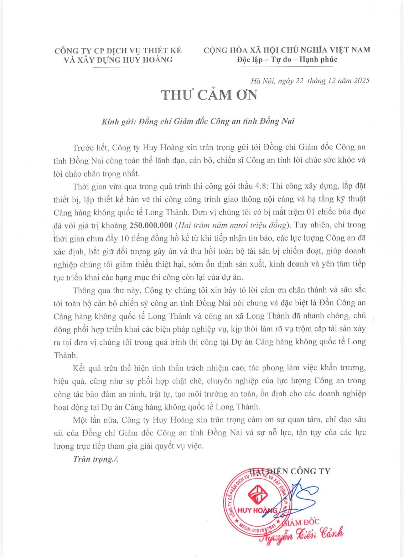 Công an tỉnh Đồng Nai vừa nhận được Thư cảm ơn của Công ty Cổ phần dịch vụ thiết kế và xây dựng Huy Hoàng.