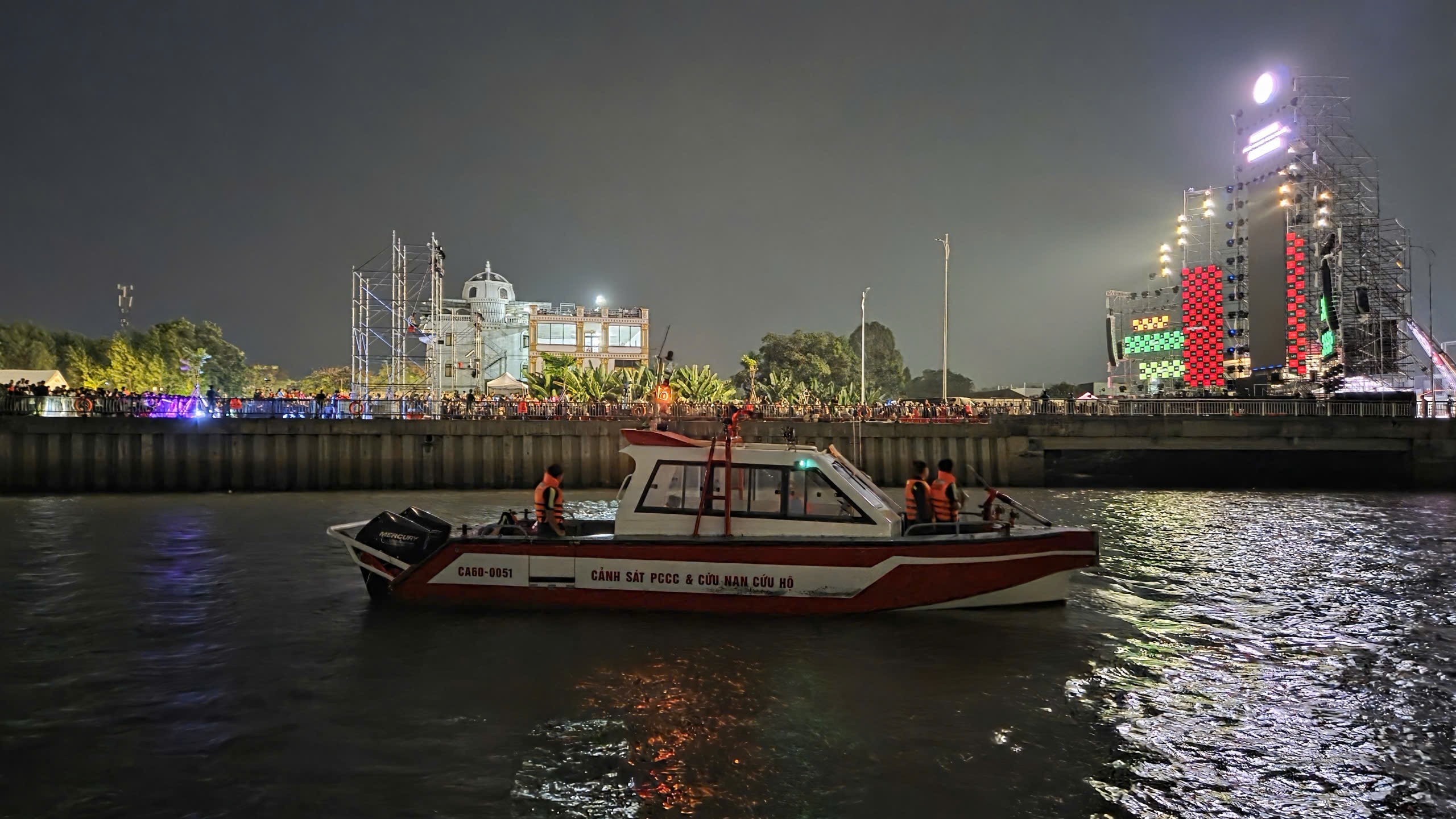 Bên cạnh công tác PCCC trên bờ, lực lượng Cảnh sát PCCC và CNCH còn bố trí lực lượng, phương tiện CNCH trên sông tại các khu vực giáp ranh sông, kênh rạch gần khu vực lễ hội; tổ chức tuần tra, kiểm soát, sẵn sàng triển khai cứu nạn, cứu hộ khi xảy ra sự cố đuối nước, tai nạn đường thủy hoặc các tình huống khẩn cấp khác.
