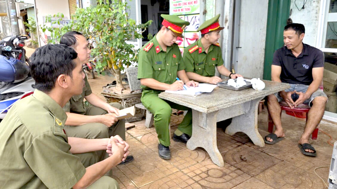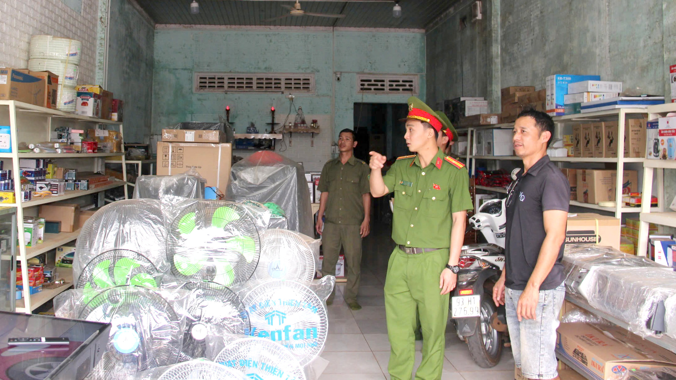 Công an xã tổ chức đi kiểm tra, tuyên truyền nhắc nhở các hộ kinh doan trên địa bàn xã.
