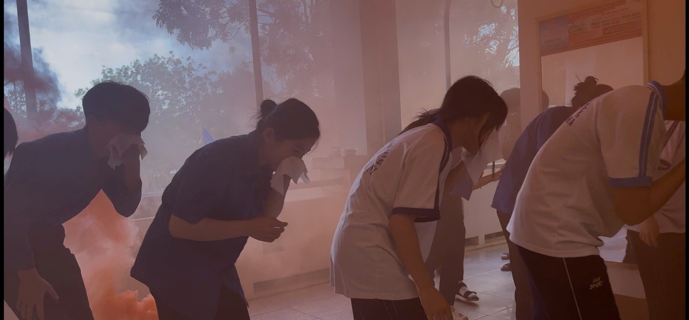 Các em học sinh trải nghiệm di chuyển thoát nạn trong môi trường có nhiều khói khí độc