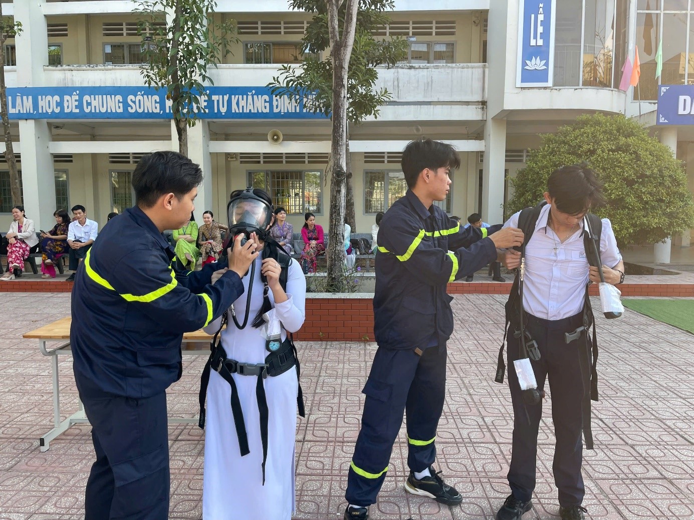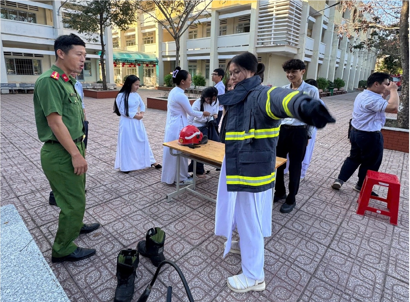 Bên cạnh nội dung lý thuyết, các em học sinh còn được trực tiếp hướng dẫn và thực hành sử dụng các phương tiện chữa cháy ban đầu như bình bột, bình khí CO₂; trải nghiệm mặc trang phục chuyên dụng, sử dụng mặt nạ phòng độc, bình khí thở của lực lượng chữa cháy chuyên nghiệp. Hoạt động thực hành đã thu hút sự quan tâm, hào hứng tham gia của đông đảo học sinh, góp phần nâng cao kỹ năng xử lý tình huống ngay từ khi sự cố mới phát sinh.