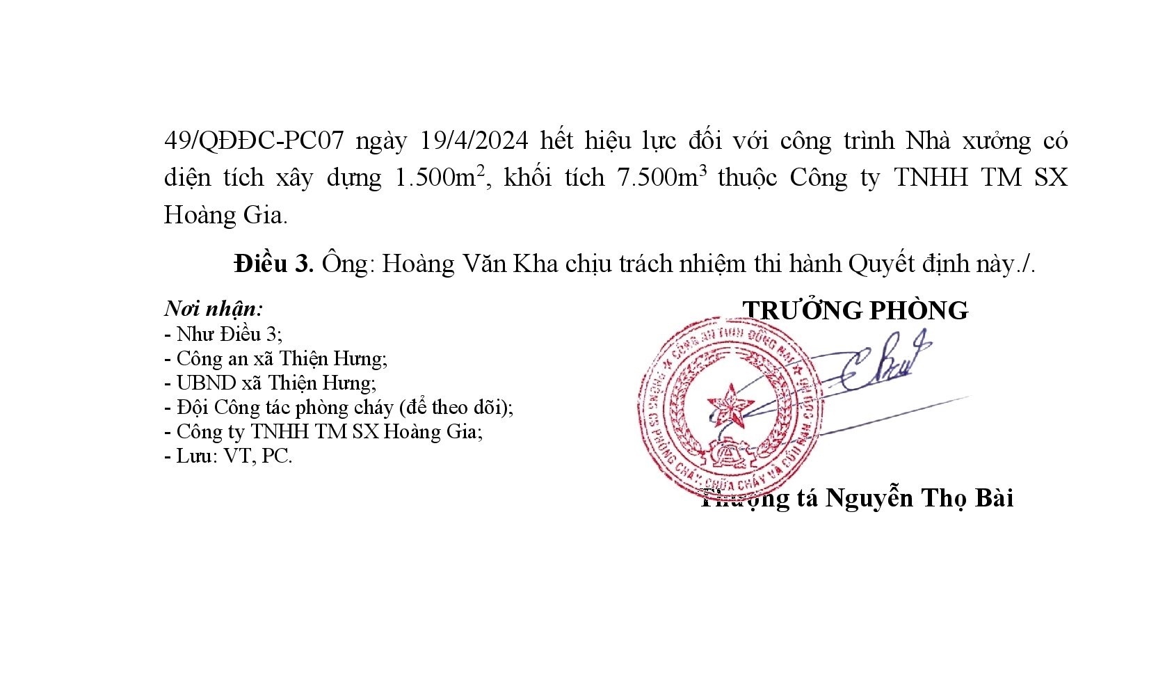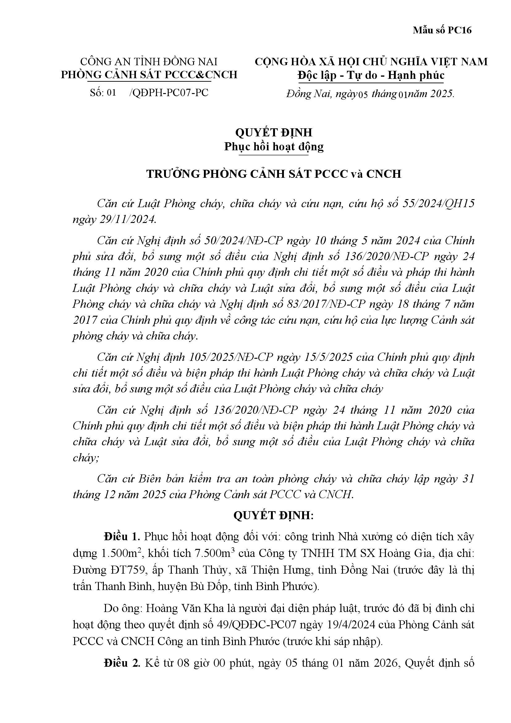 Trưởng phòng Cảnh sát PCCC và CNCH Công an tỉnh Đồng Nai quyết định phục hồi hoạt động đối với công trình Nhà xưởng của Công ty TNHH TM SX Hoàng Gia, địa chỉ: Đường ĐT759, ấp Thanh Thủy, xã Thiện Hưng, tỉnh Đồng Nai (trước đây là thị trấn Thanh Bình, huyện Bù Đốp, tỉnh Bình Phước)