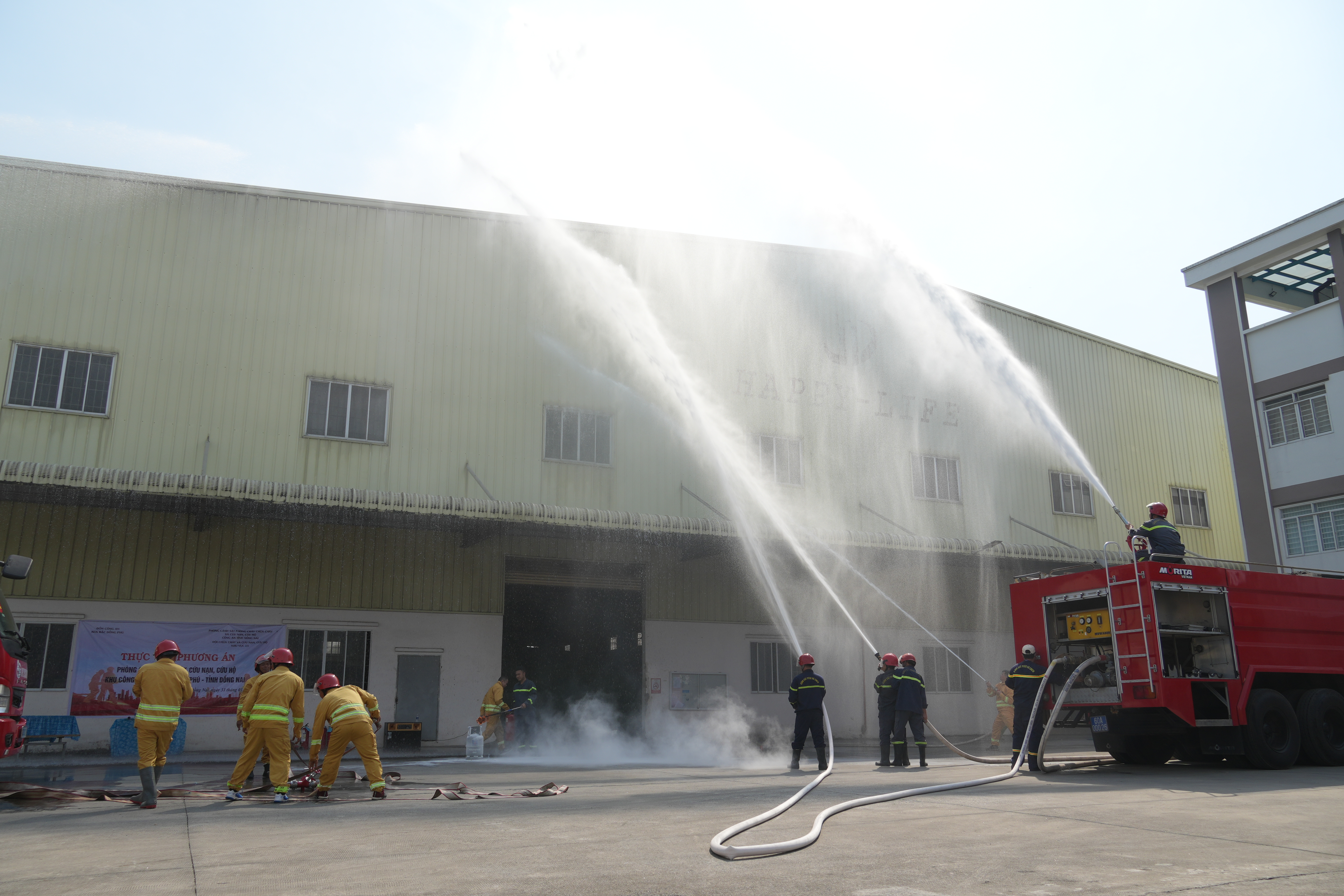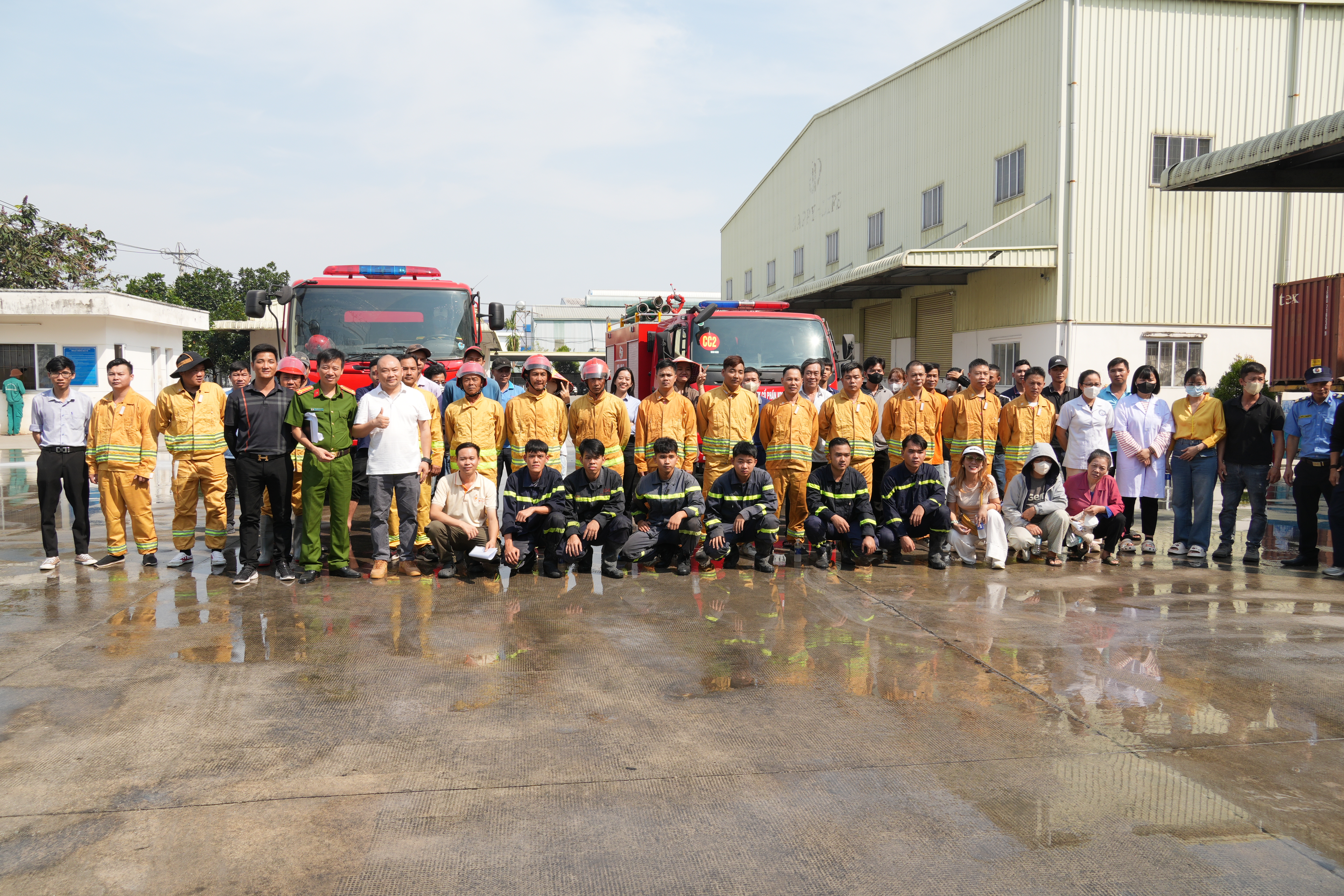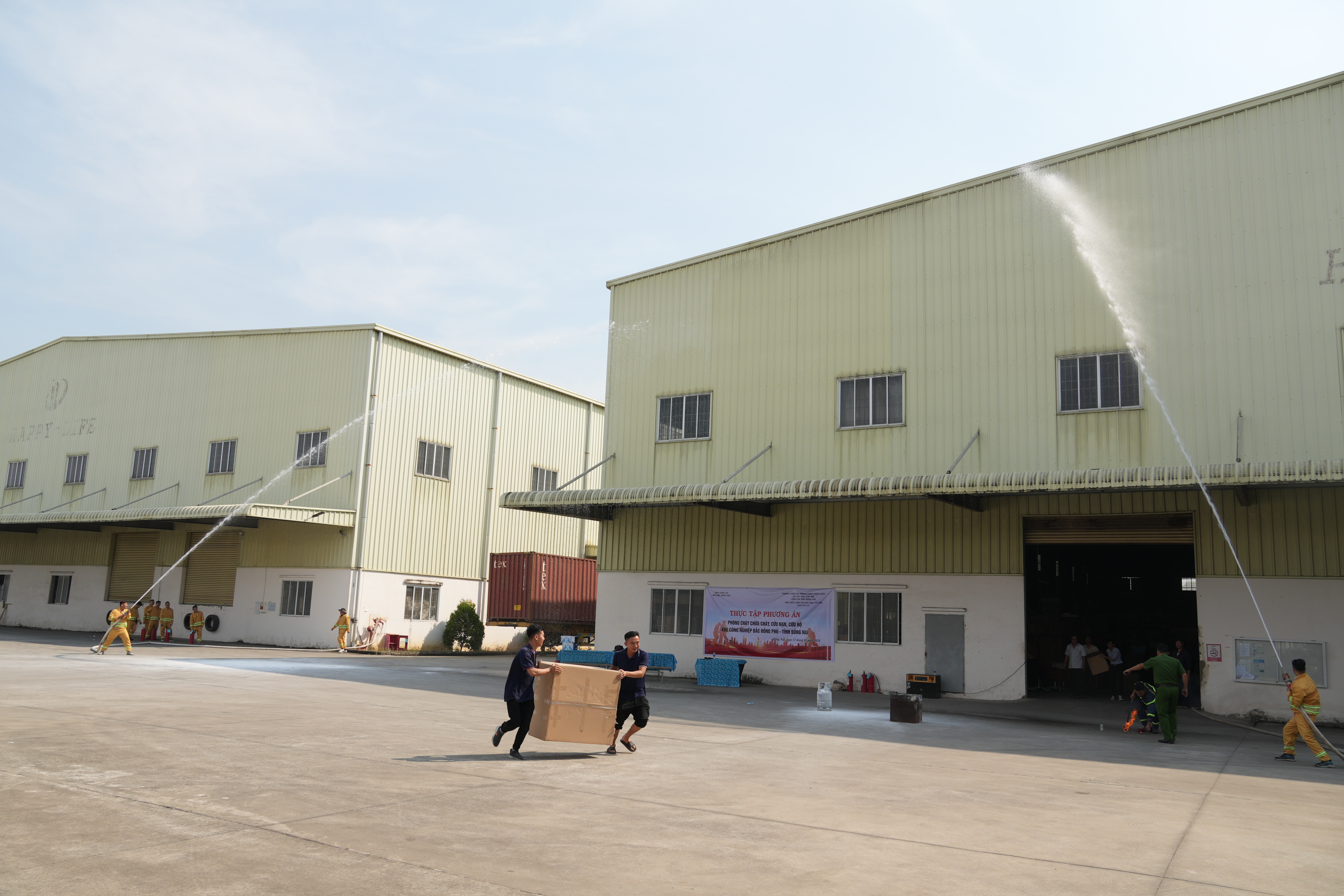 Theo tình huống giả định, do sự cố chập điện tại khu vực nhà xưởng đã xảy ra cháy, ngọn lửa nhanh chóng lan rộng, khói tỏa dày đặc, nhiều công nhân hoảng loạn tìm cách thoát ra ngoài, một số người bị mắc kẹt bên trong. Ngay khi phát hiện cháy, lực lượng PCCC Công ty đã sử dụng phương tiện chữa cháy tại chỗ tổ chức dập lửa ban đầu, đồng thời hướng dẫn công nhân thoát nạn.