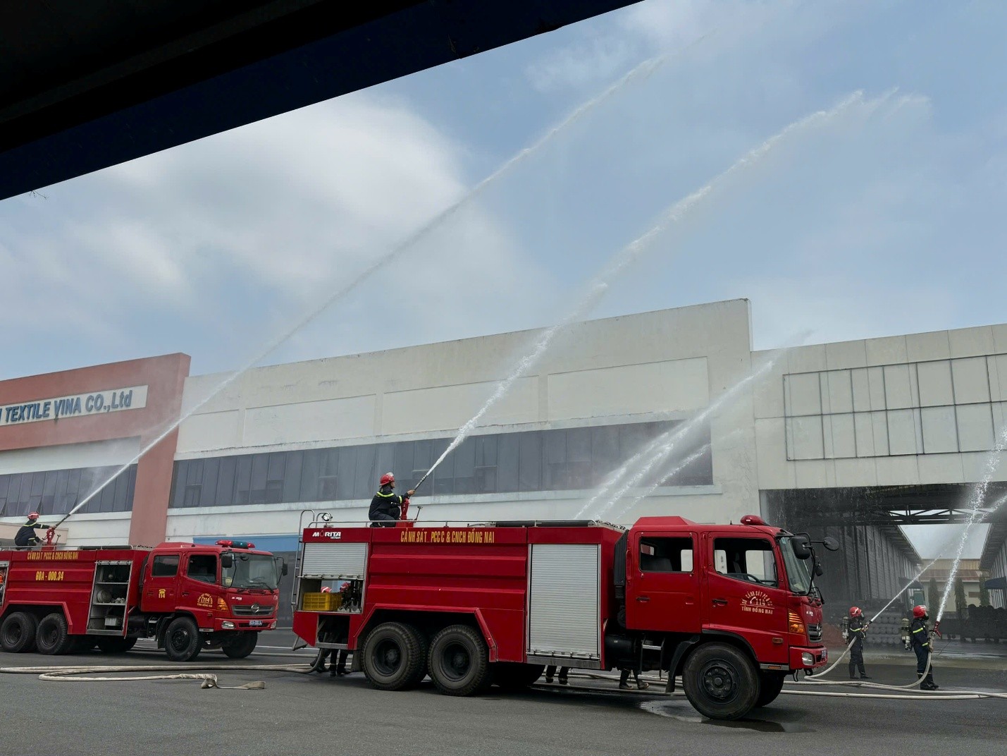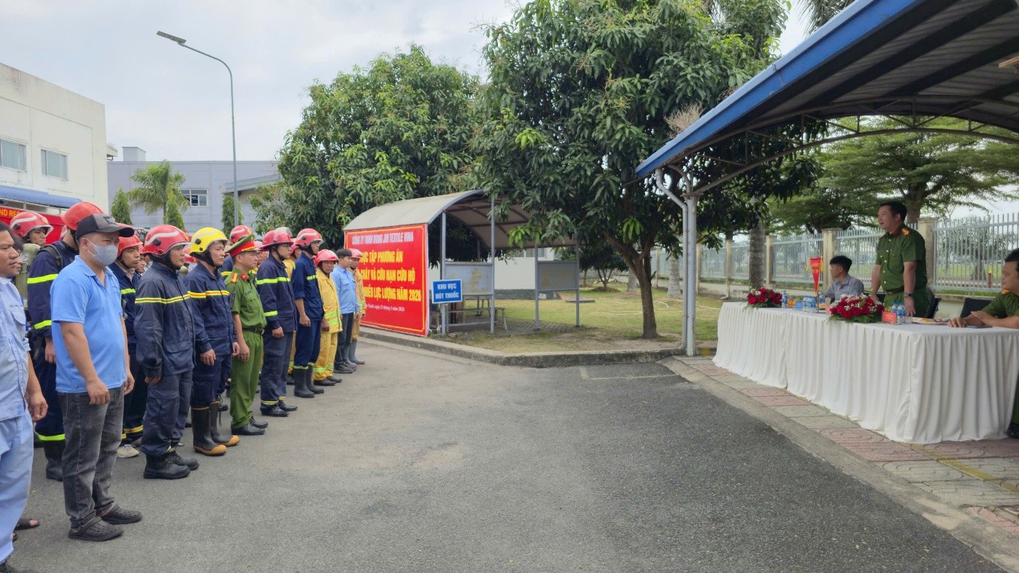 Theo tình huống giả định, trong quá trình sản xuất tại khu vực kho thành phẩm xảy ra cháy do chập hệ thống điện, gây phát sinh tia lửa bén vào các vật liệu dễ cháy như vải, sợi, bao bì carton, nylon, pallet… khiến đám cháy nhanh chóng bùng phát trên diện tích khoảng 80m². Do khu vực chứa nhiều chất dễ cháy, đám cháy lan nhanh, tiềm ẩn nguy cơ cháy lan sang toàn bộ nhà kho và các công trình lân cận.