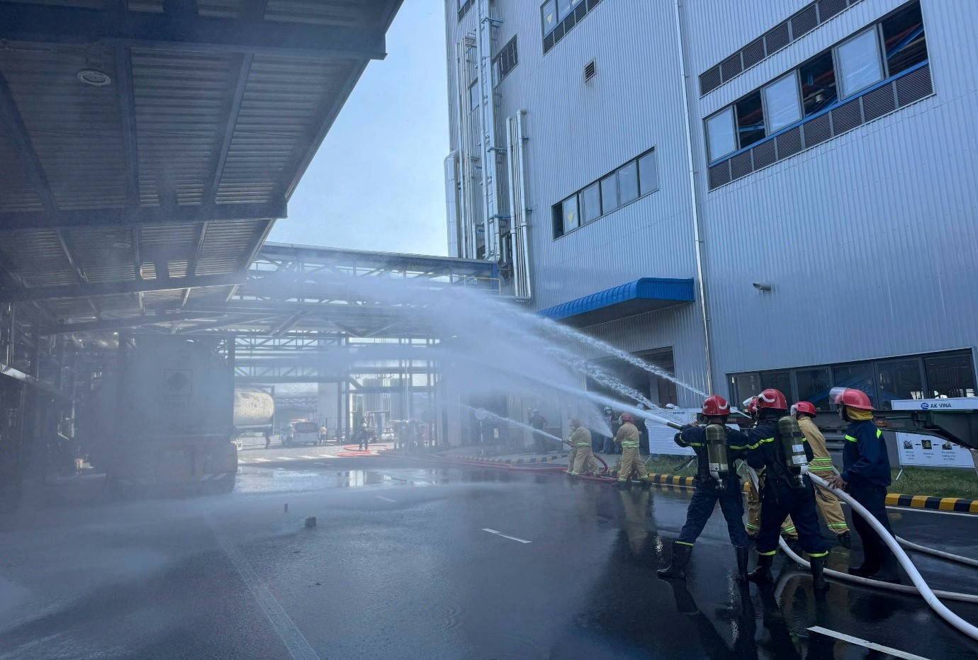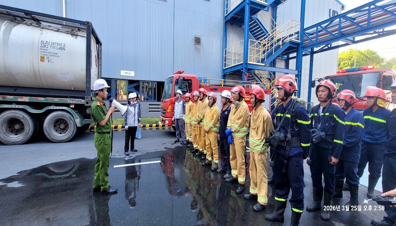 Tình huống giả định được đặt ra là tại khu vực trạm bơm hóa chất của công ty do sự cố trong quá trình bơm hóa chất vào xe bồn xảy ra cháy, đám cháy nhanh chóng phát triển, tỏa nhiều khói, khí độc và có nguy cơ cháy lan sang các khu vực lân cận. Tại thời điểm xảy ra sự cố, có nhiều công nhân đang làm việc, 02 người bị mắc kẹt trong khu vực cháy.