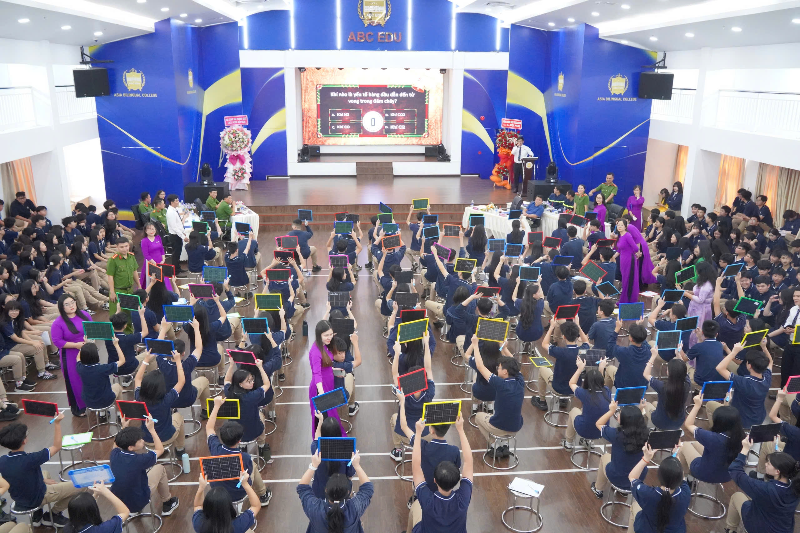 Điểm nhấn của chương trình là Hội thi “Rung chuông vàng” với nhiều câu hỏi xoay quanh kiến thức phòng cháy, nguyên nhân cháy nổ, kỹ năng thoát nạn và sử dụng phương tiện chữa cháy ban đầu. Nhiều tình huống thực tế được đưa ra buộc học sinh phải vận dụng linh hoạt kiến thức để xử lý, qua đó nâng cao khả năng phản xạ khi gặp sự cố.