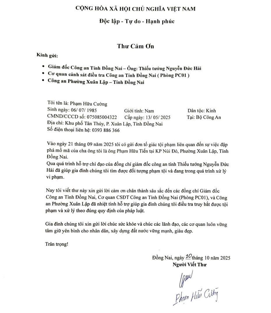 Thư cảm ơn Công an tỉnh Đồng Nai của gia đình bị hại