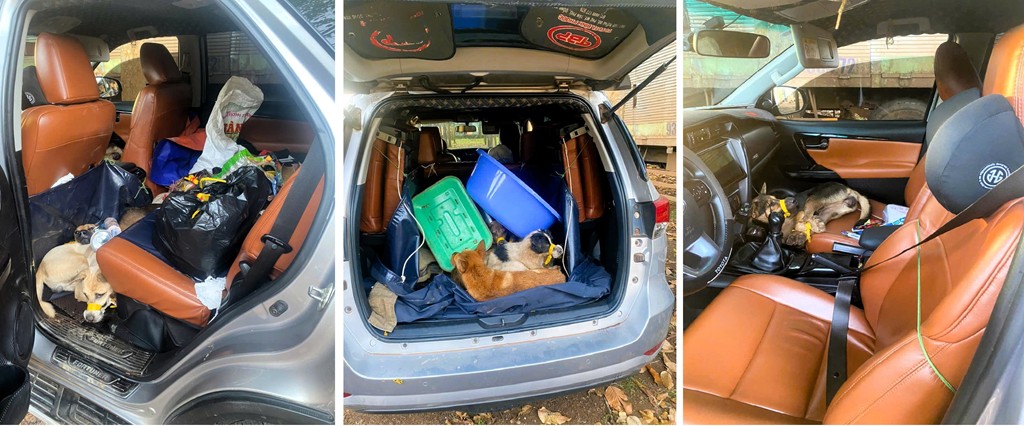 Tiến hành kiểm tra, khám xét nơi ở của Trung và Huế, lực lượng Công an phát hiện tại khu vực sân nhà có 4 con chó; kiểm tra chiếc xe ô tô Fortuner nói trên phát hiện 7 con chó cùng nhiều tang vật phục vụ việc trộm cắp và tẩu thoát như súng điện, bình xịt hơi cay, đinh, dao, kéo… Tiếp tục kiểm tra phía trong nhà, lực lượng chức năng phát hiện thêm 4 con chó. Tang vật tạm giữ gồm: 15 con chó với tổng trọng lượng 202kg, 1 xe ô tô Toyota Fortuner biển kiểm soát 93A-331.38 cùng nhiều công cụ, phương tiện liên quan.