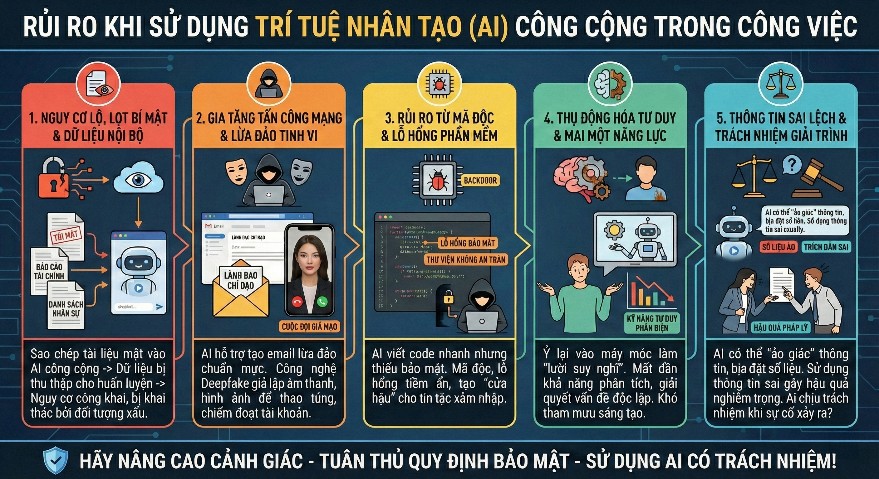 Để đảm bảo an toàn, an ninh thông tin trong tình hình mới, Phòng An ninh mạng và phòng chống tội phạm sử dụng công nghệ cao khuyến cáo các cơ quan, đơn vị cần sớm hoàn thiện hành lang pháp lý, ban hành quy chế quản lý chặt chẽ việc ứng dụng công nghệ trong công tác. Đồng thời, mỗi cán bộ, nhân viên cần nâng cao ý thức cảnh giác, tuân thủ nghiêm ngặt các nguyên tắc bảo mật và luôn duy trì tư duy độc lập, kiểm chứng kỹ lưỡng mọi kết quả do công nghệ mang lại. Chỉ có sự tỉnh táo và bản lĩnh của yếu tố con người mới là bức tường lửa vững chắc nhất trước mọi rủi ro của kỷ nguyên số.