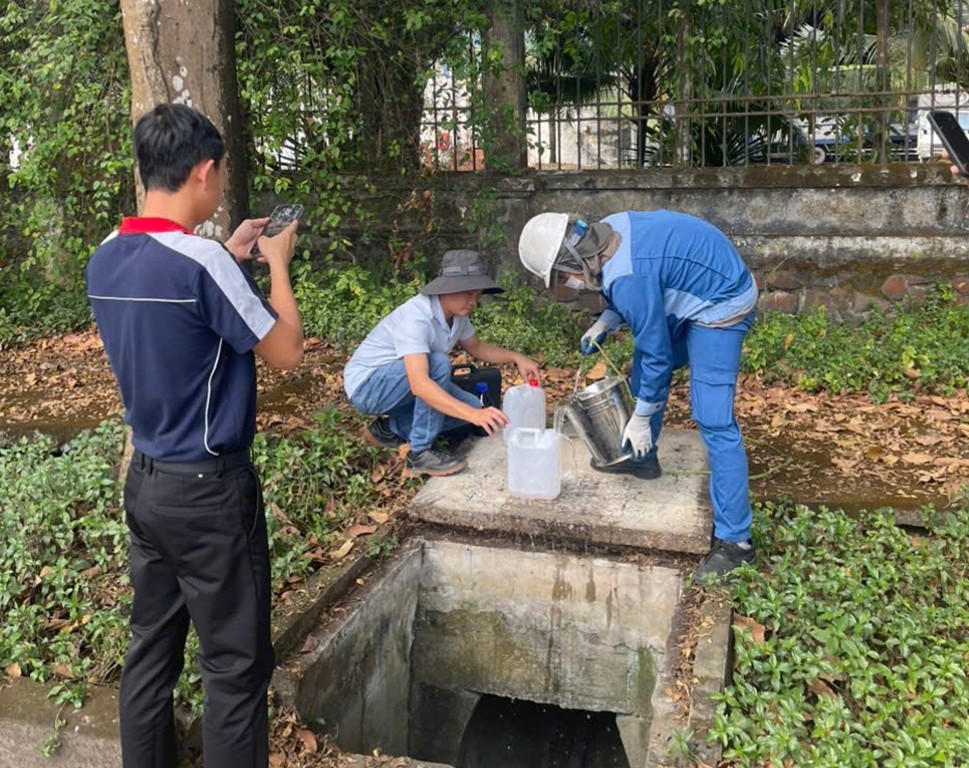 Đoàn kiểm tra phối hợp với đơn vị có chức năng thu mẫu nước thải