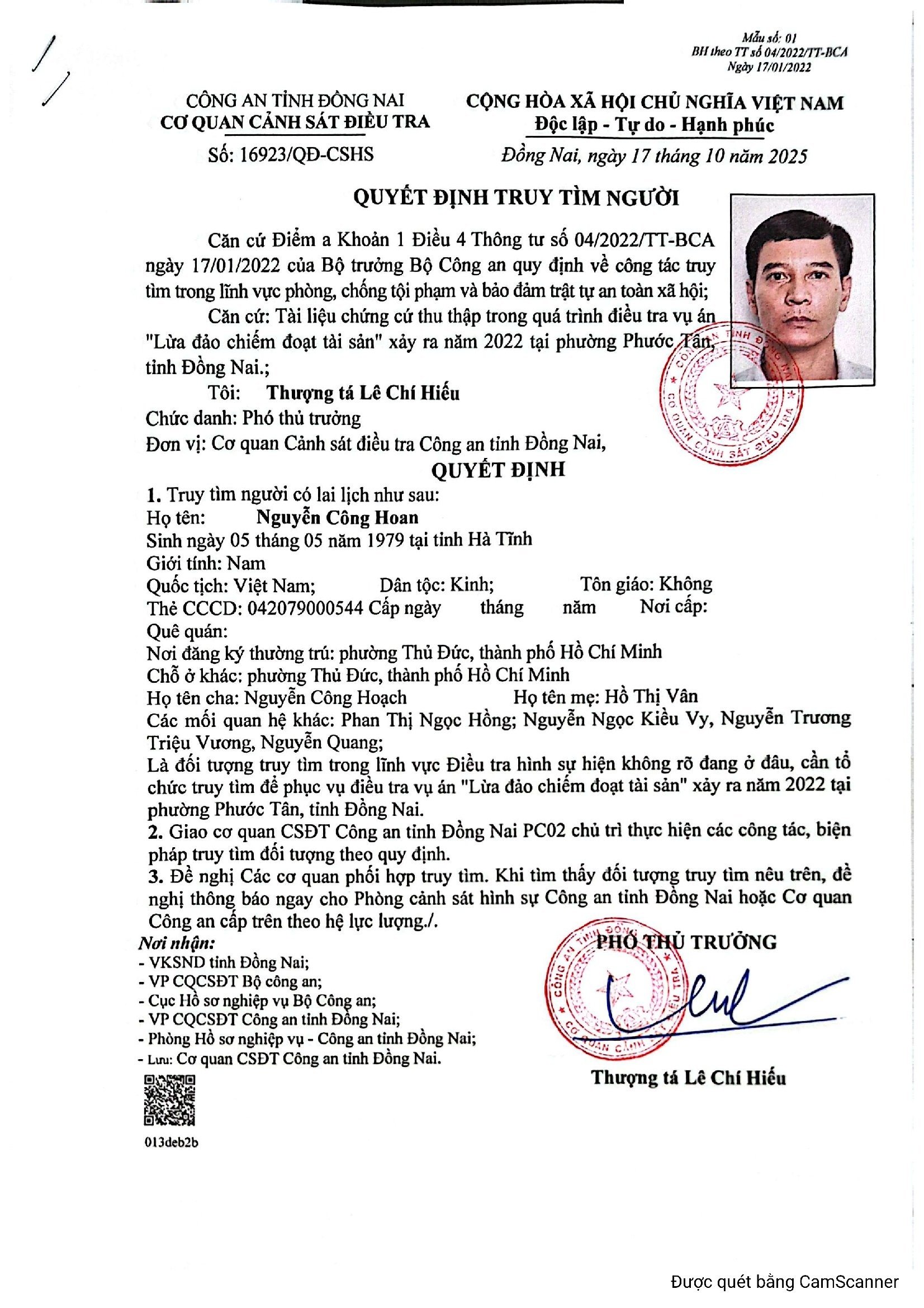 Cơ quan Cảnh sát điều tra Công an tỉnh Đồng Nai truy tìm đối với Nguyễn Công Hoan, sinh năm 1979 để điều tra vụ án "Lừa đảo chiếm đoạt tài sản" xảy ra năm 2022 tại địa bàn phường Phước Tân, tỉnh Đồng Nai.
