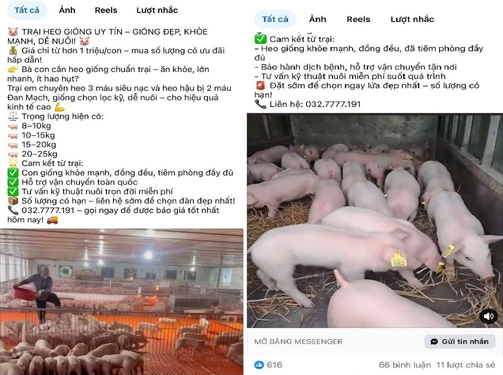 Một điểm trùng hợp đáng chú ý là cả hai vụ việc đều xuất phát từ hoạt động rao bán heo giống trên mạng xã hội Facebook với nhiều nội dung quảng cáo hấp dẫn như: Cam kết heo giống khỏe mạnh, đồng đều, đã tiêm phòng đầy đủ; bảo hành dịch bệnh; hỗ trợ vận chuyển tận nơi; mua 10 con tặng 1 con; tư vấn kỹ thuật chăn nuôi miễn phí…