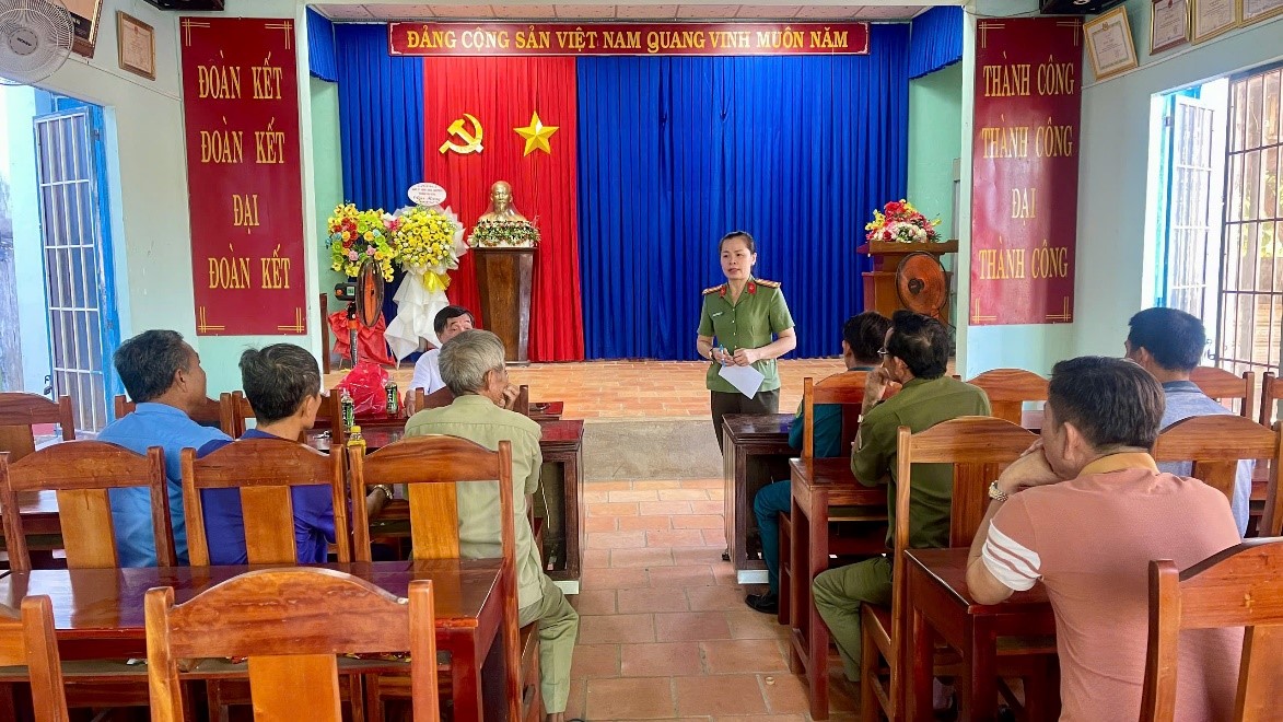 Trung tá Lê Thị Thanh Bình, Phó trưởng Công an phường Bình Phước phát biểu động viên và hướng dẫn nghiệp vụ hoạt động cho thành viên Tổ tự quản về ANTT khu phố Tân Đồng 4.