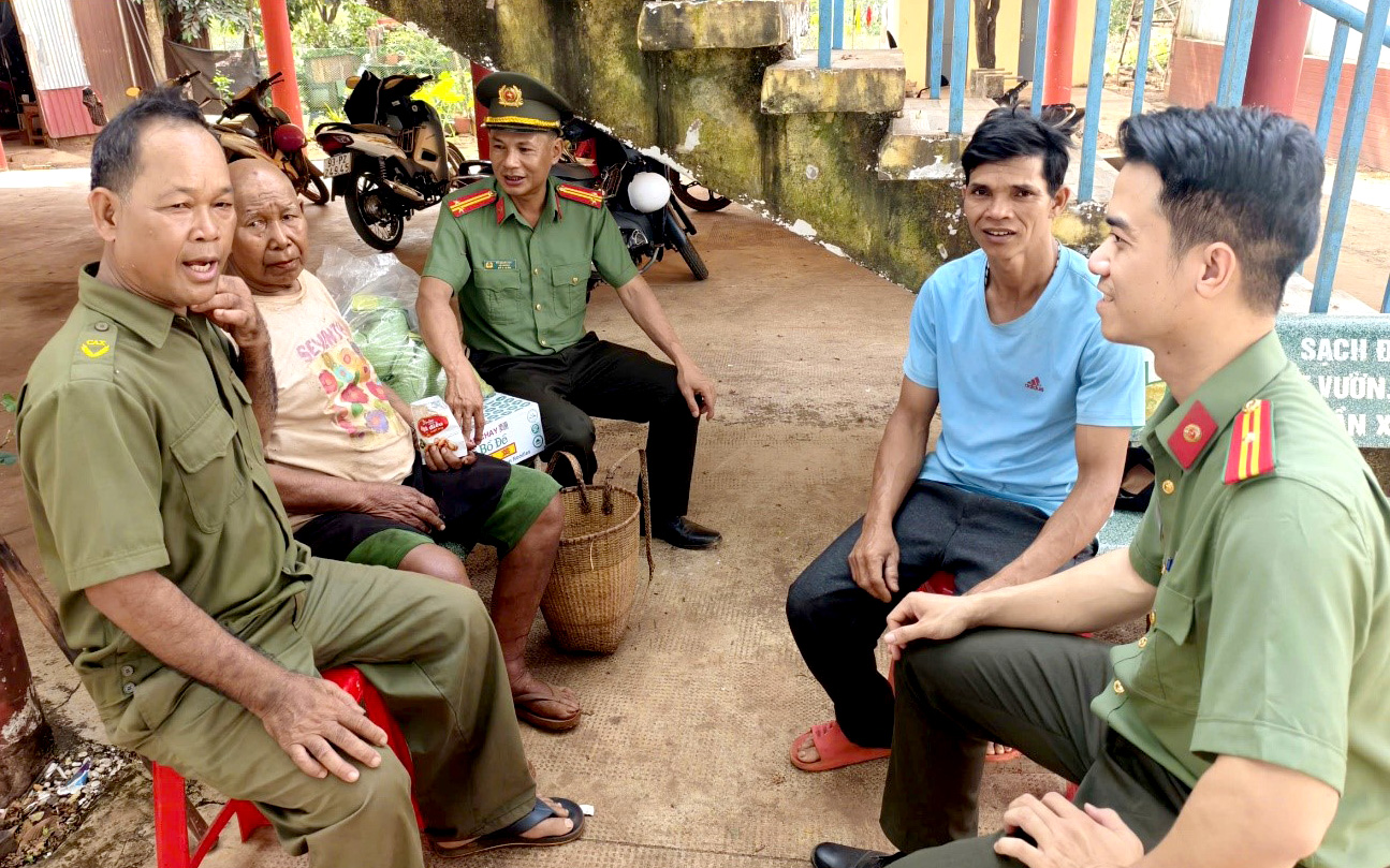 Cán bộ Công an xã gặp gỡ, tiếp xúc với người có uy tín trong đồng bào dân tộc thiểu số để nắm bắt tình hình địa bàn.
