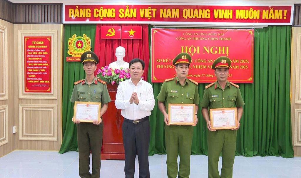 Dịp này, Chủ tịch UBND phường Chơn Thành đã tặng Giấy khen cho 1 tập thể và 05 cá nhân thuộc Công an phường có thành tích xuất sắc trong cao điểm tấn công, trấn áp tội phạm bảo đảm ANTT dịp kỷ niệm 80 năm Cách mạng Tháng Tám và Quốc khánh 2/9, đồng thời khen thưởng đột xuất 1 cá nhân có thành tích tiêu biểu trong công tác đấu tranh phòng, chống tội phạm trên địa bàn.