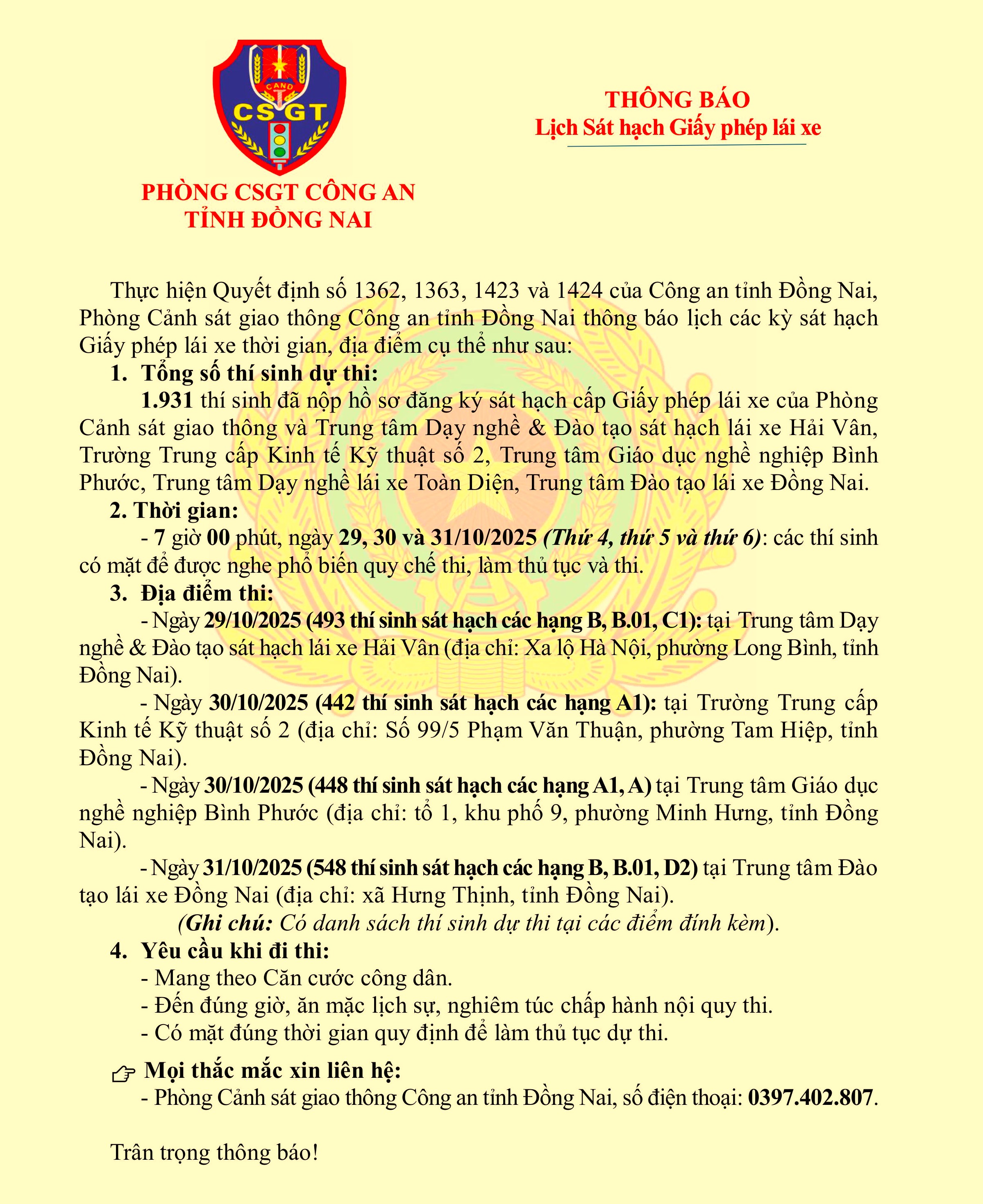 Phòng Cảnh sát giao thông, Công an tỉnh Đồng Nai trân trọng thông báo thời gian, địa điểm thực hiện sát hạch Giấy phép lái xe, cụ thể như sau: