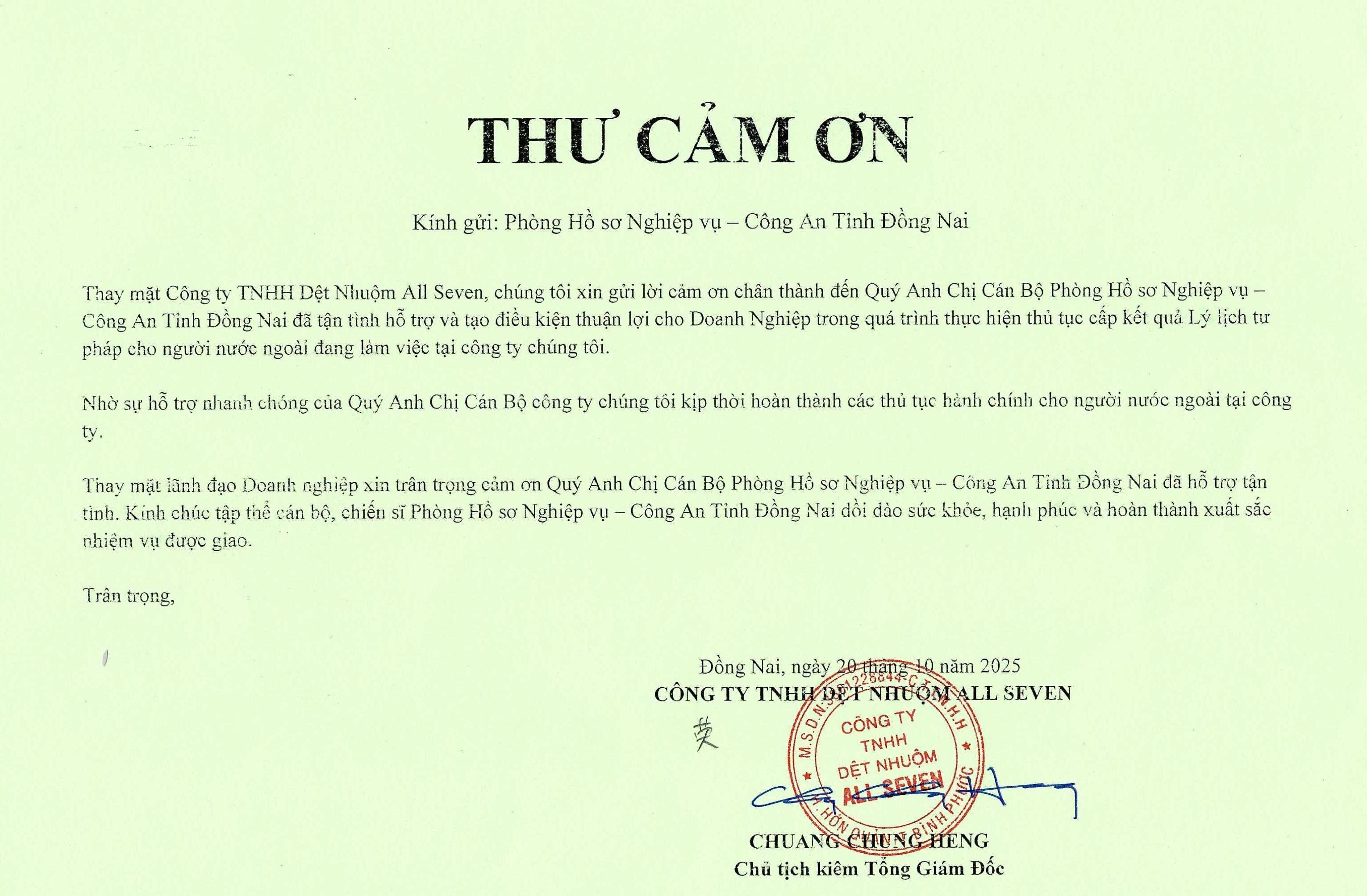 Trong Thư, Ban Giám đốc Công ty bày tỏ lời cảm ơn chân thành đến cán bộ, chiến sĩ Phòng Hồ sơ nghiệp vụ vì đã tận tình hỗ trợ, hướng dẫn doanh nghiệp trong quá trình tra cứu, xác minh thông tin, tạo điều kiện thuận lợi cho hoạt động sản xuất, kinh doanh của doanh nghiệp. Thư cảm ơn của Công ty TNHH Dệt nhuộm All Seven Khu công nghiệp Minh Hưng - Sikico, xã Tân Khai, tỉnh Đồng Nai một lần nữa minh chứng cho sự ghi nhận của người dân, doanh nghiệp đối với nỗ lực cải cách hành chính, nâng cao chất lượng phục vụ của lực lượng Công an Đồng Nai, góp phần xây dựng hình ảnh người chiến sĩ Công an “Vì Nhân dân phục vụ”.