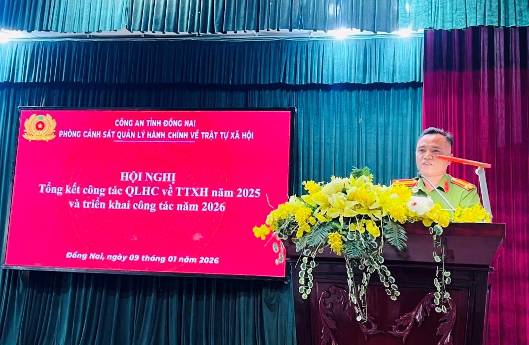 Hội nghị đã lắng nghe và quán triệt kết luận chỉ đạo của đồng chí Giám đốc Công an tỉnh tại Hội nghị tổng kết công tác Công an năm 2025, triển khai nhiệm vụ công tác năm 2026 của Công an tỉnh. Đánh giá kết quả các mặt công QLHC về TTXH năm 2025, Hội nghị khẳng định: mặc dù có nhiều biến động, thay đổi lớn mang tính bước ngoặt như sáp nhập địa giới và tăng quy mô dân số, thực hiện chính quyền địa phương 2 cấp và bỏ Công an cấp huyện; đối mặt với những thách thức thực tiễn chưa từng có tiền lệ, lực lượng CSQLHC về TTXH tỉnh Đồng Nai đã có nhiều cố gắng, nỗ lực trong tham mưu, chỉ đạo, triển khai thực hiện các mặt công tác và hoàn thành xuất sắc các mặt công tác được giao như: Hoàn thành 10/10 các nhiệm vụ được giao khi thực hiện chính quyền 02 cấp (giải thể Công an cấp huyện); Hoàn thành 41/41 nhiệm vụ Công tỉnh giao phòng PC06. Trong đó, đối với nhiệm vụ: Hồ sơ dịch vụ công trực tuyến: nhờ các giải pháp quyết liệt, riêng tháng 12 tỉ lệ hồ sơ dịch vụ công đối với thủ tục cấp thẻ Căn cước đã đạt 79,07% (vượt chỉ tiêu 60%) tạo đà hoàn thành chỉ tiêu cho năm 2026 (dự kiến 80%); đảm bảo hoàn thành đúng tiến độ 27/27 nhiệm vụ Bộ Công an (Cục C06) giao theo hệ CSQLHC về TTXH. Trong đó, phòng Cảnh sát QLHC về TTXH với vai trò Tư lệnh ngành đã bám sát chỉ đạo của Lãnh đạo Công an tỉnh và hướng dẫn nghiệp vụ của Cục Cảnh sát QLHC về TTXH, chủ động tham mưu, đề xuất các chủ trương, biện pháp công tác đồng thời đồng hành cùng Công an cơ sở trong triển khai, trực tiếp đến từng xã, phường “cầm tay chỉ việc”, hướng dẫn, đôn đốc thực hiện nhiệm vụ được giao.