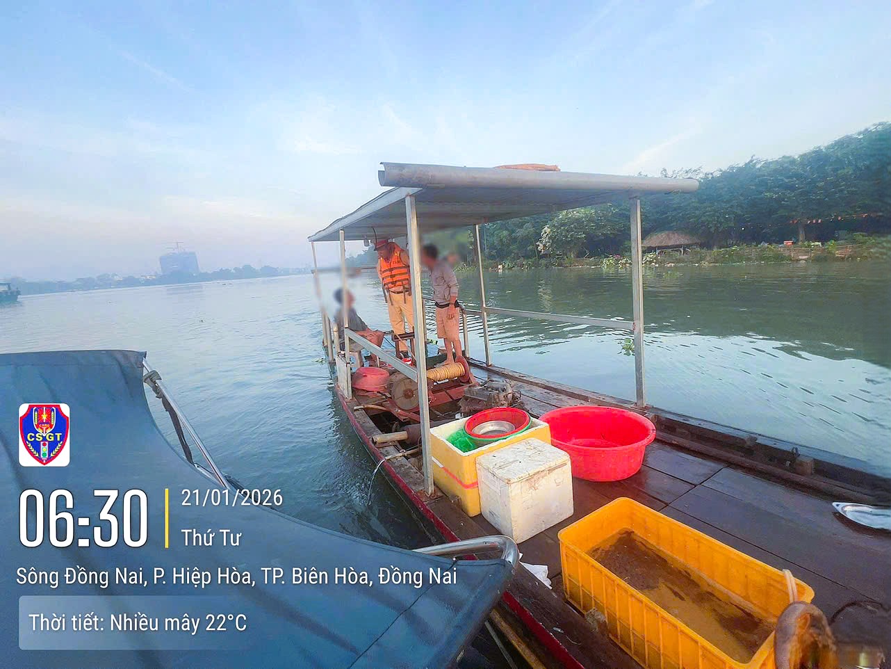 Trước đó, vào khoảng 5 giờ 30 phút ngày 21/01, trong quá trình tuần tra, kiểm soát trên tuyến sông Đồng Nai đoạn qua phường Trấn Biên, tỉnh Đồng Nai, lực lượng Cảnh sát đường thủy phát hiện ông K.Q.S. (43 tuổi, ngụ tỉnh Đồng Nai) điều khiển ghe gỗ không số hiệu, đang sử dụng công cụ kích điện để đánh bắt tôm, cá nên đã dừng phương tiện kiểm tra, lập biên bản.