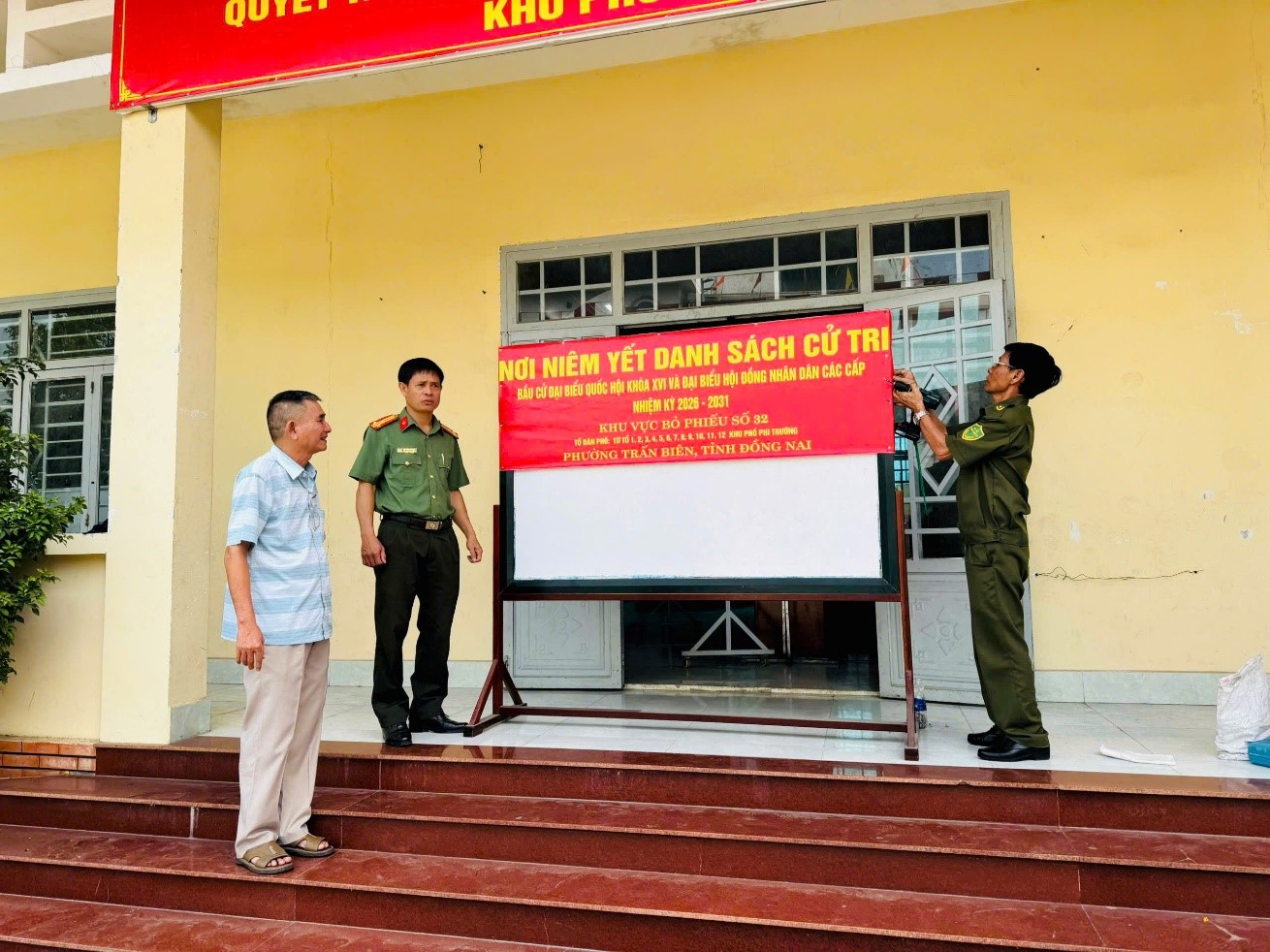 Đồng chí Thượng tá Nguyễn Văn Huy - Phó Trưởng phòng An ninh chính trị nội bộ kiểm tra công tác chuẩn bị bầu cử tại Khu vực bỏ phiếu số 32, phường Trấn Biên, tỉnh Đồng Nai