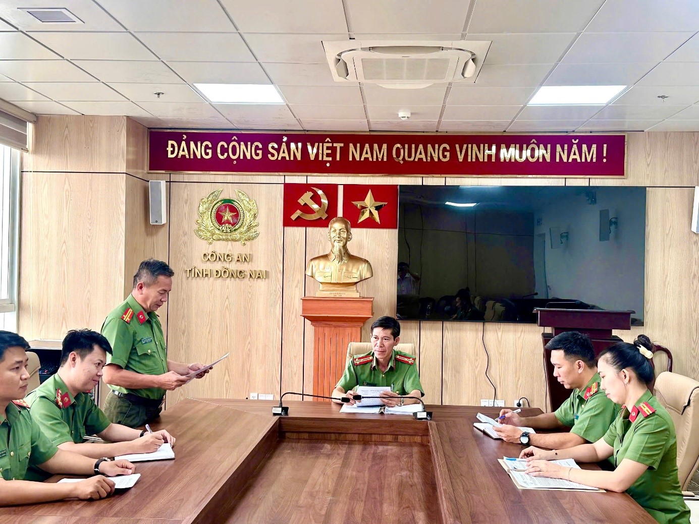 Đoàn kiểm tra của Phòng An ninh chính trị nội bộ trực tiếp kiểm tra, hướng dẫn công tác đảm bảo ANTT phục vụ bầu cử tại Công an phường Tân Triều, tỉnh Đồng Nai
