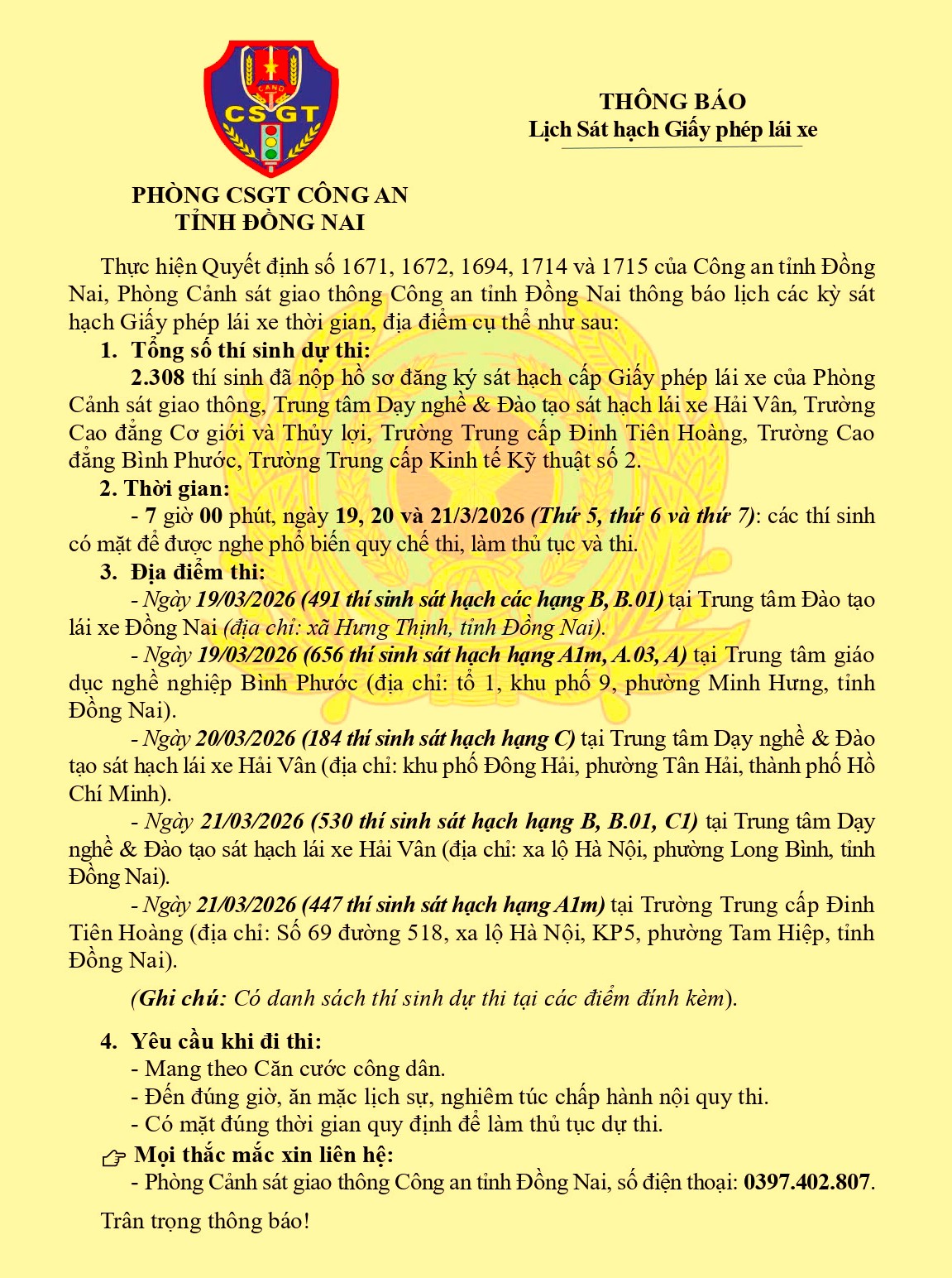 Đồng Nai: Tổ chức sát hạch lái xe cho hơn 1.100 thí sinh trong một ngày