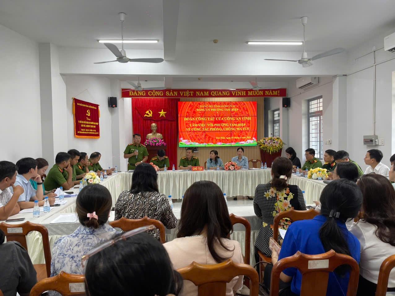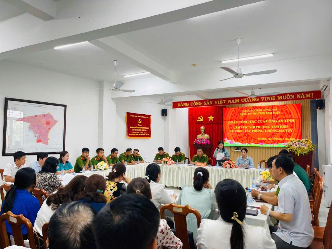 Tại buổi làm việc, Đoàn công tác ghi nhận Đảng ủy phường Tam Hiệp đã cơ bản thực hiện tốt vai trò lãnh đạo, chỉ đạo trong công tác phòng, chống ma túy. Nhiều văn bản quan trọng được ban hành kịp thời như Nghị quyết về xây dựng phường không ma túy; kế hoạch lộ trình cụ thể phấn đấu đến năm 2030 đạt 100% khu phố không ma túy. Công tác tuyên truyền được triển khai đa dạng thông qua hệ thống loa phát thanh, mạng xã hội, đồng thời phối hợp chặt chẽ với 21 cơ sở giáo dục trên địa bàn. Địa phương cũng đã thành lập điểm tư vấn, hỗ trợ điều trị cai nghiện tại cộng đồng và đội công tác xã hội tình nguyện.