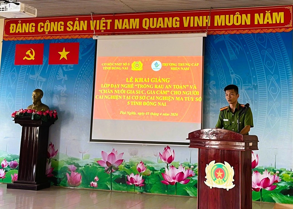 Ngày 05/4/2026, Cơ sở Cai nghiện số 5, Phòng Cảnh sát điều tra tội phạm về ma túy Công an tỉnh Đồng Nai phối hợp với Trường Trung cấp Miền Nam tổ chức Lễ khai giảng 02 lớp dạy nghề cho học viên đang cai nghiện tại cơ sở.