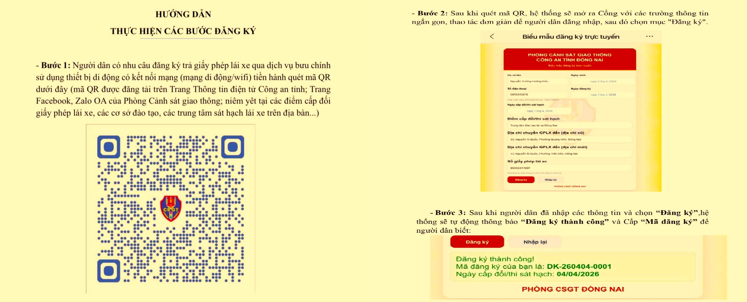 Theo đó, người dân có nhu cầu nhận GPLX tại nhà chỉ cần sử dụng điện thoại thông minh có kết nối internet để quét mã QR do Phòng Cảnh sát giao thông cung cấp. Mã QR được đăng tải trên Trang thông tin điện tử Công an tỉnh, các nền tảng mạng xã hội chính thức của Phòng CSGT Công an tỉnh như Facebook, Zalo OA, đồng thời niêm yết tại các điểm cấp đổi GPLX, cơ sở đào tạo và trung tâm sát hạch lái xe trên địa bàn.