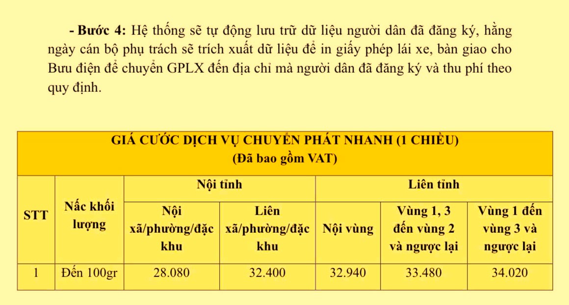 Cùng với quy trình minh bạch, cơ quan chức năng cũng công bố mức phí chuyển phát nhanh một chiều (đã bao gồm VAT) theo từng khu vực để người dân chủ động lựa chọn. Cụ thể, với bưu gửi đến 100g: nội tỉnh cùng xã/phường/đặc khu là 28.080 đồng; khác xã/phường/đặc khu là 32.400 đồng; liên tỉnh nội vùng là 32.940 đồng; từ vùng 1, 3 đến vùng 2 và ngược lại là 33.480 đồng; từ vùng 1 đến vùng 3 và ngược lại là 34.020 đồng.