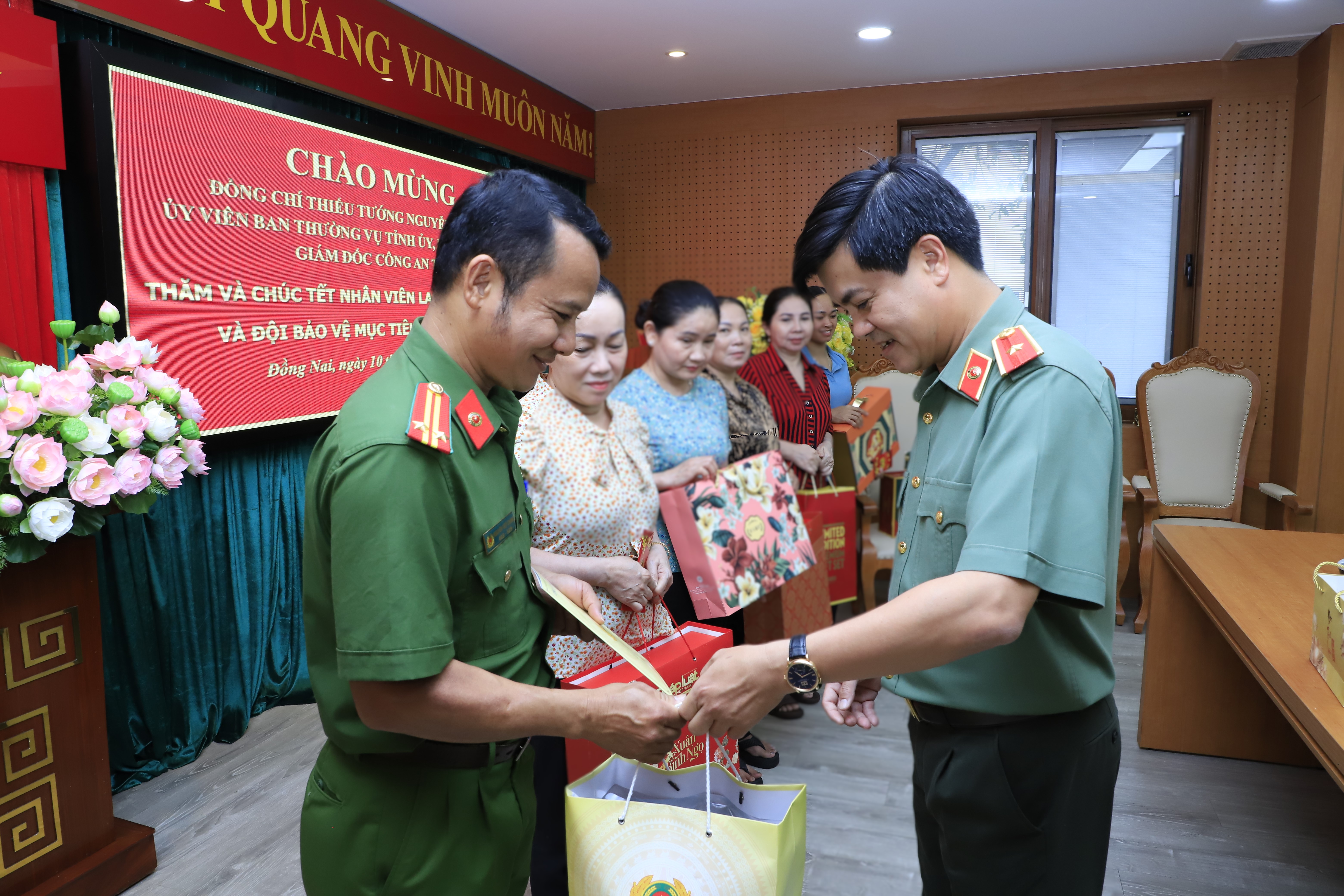 Đồng chí Thiếu tướng Nguyễn Đức Hải, Giám đốc Công an tỉnh tặng quà Tết và ghi nhận, biểu dương cán bộ, chiến sĩ Cảnh sát bảo vệ mục tiêu đã bảo đảm an ninh, an toàn các mục tiêu thời gian qua