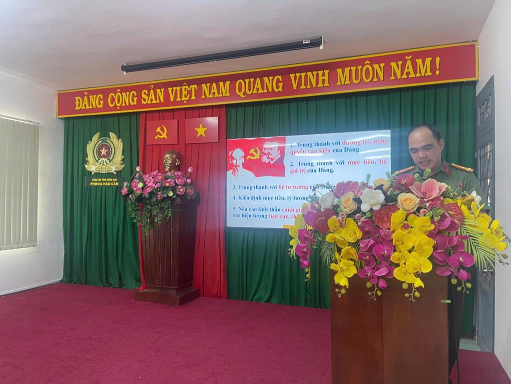 Đồng chí Thượng tá Nguyễn Văn Hải – Phó Bí thư Đảng ủy, Phó trưởng phòng Hậu cần Công an tỉnh phát biểu khai mạc Hội nghị sinh hoạt chuyên đề