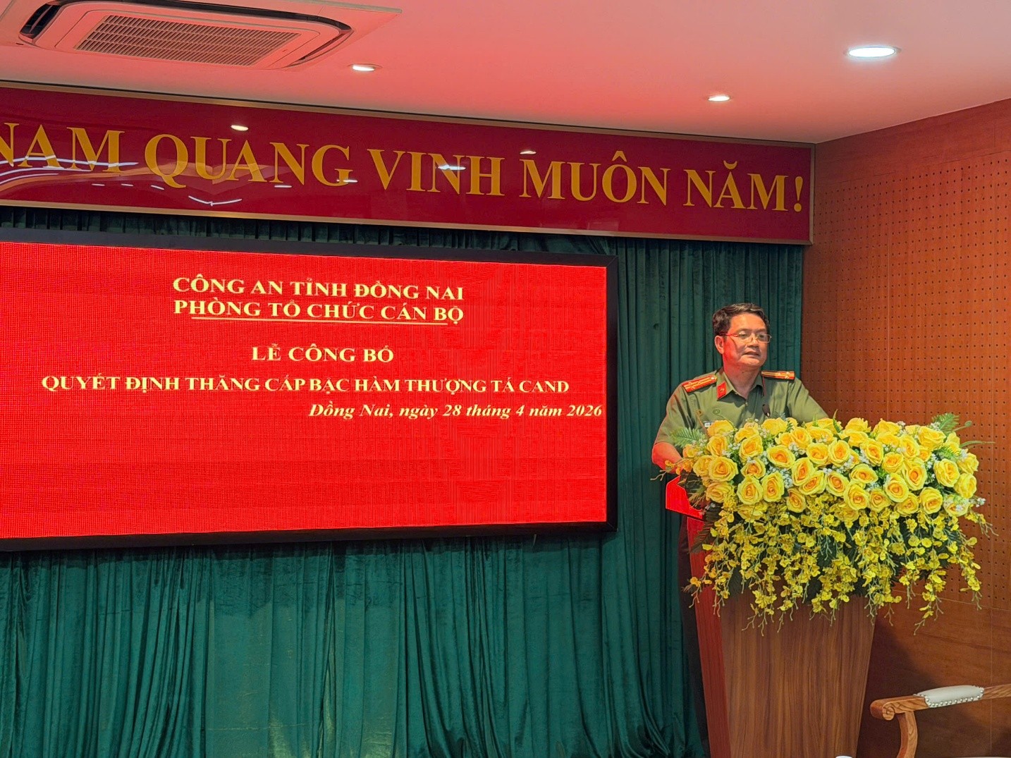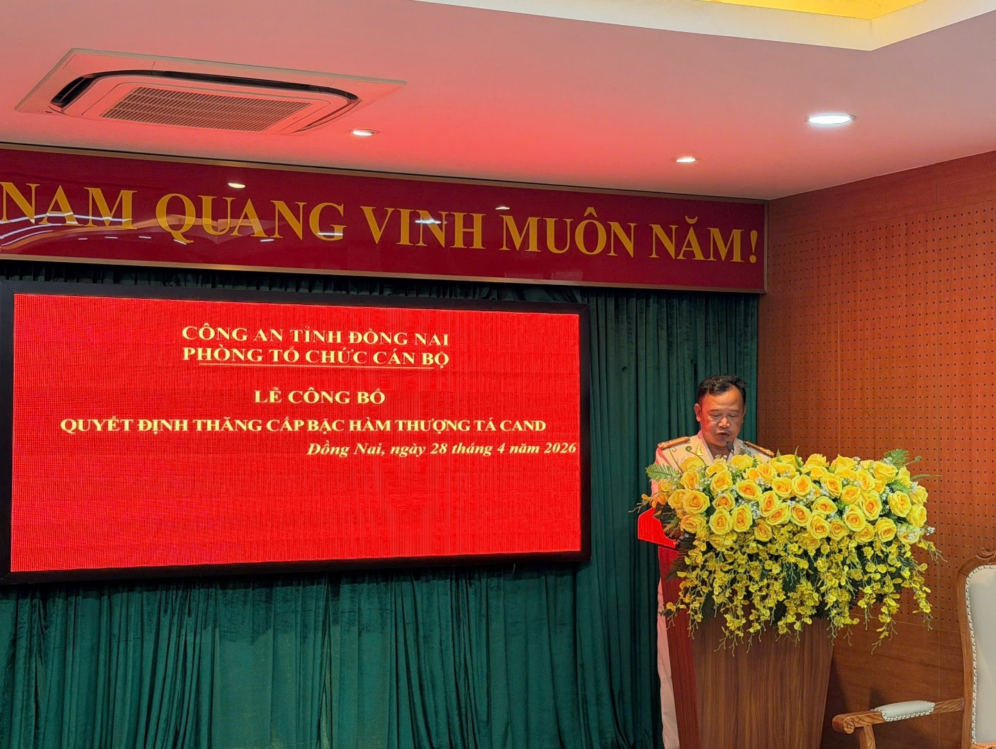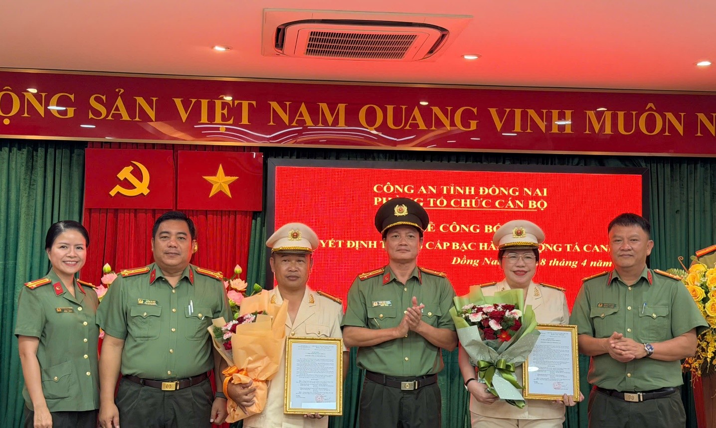 Phát biểu chỉ đạo tại buổi lễ, đồng chí Thượng tá Trần Anh Chiến - Phó Trưởng Phòng Tổ chức cán bộ đã chúc mừng hai đồng chí được thăng cấp bậc hàm. Đồng chí nhấn mạnh, việc thăng cấp bậc không chỉ là niềm vinh dự mà còn đi kèm với trách nhiệm lớn lao, đòi hỏi mỗi cán bộ phải tiếp tục phát huy tinh thần trách nhiệm, gương mẫu đi đầu trong công tác, giữ vững phẩm chất đạo đức cách mạng, góp phần xây dựng lực lượng Công an tỉnh Đồng Nai ngày càng chính quy, tinh nhuệ, hiện đại.