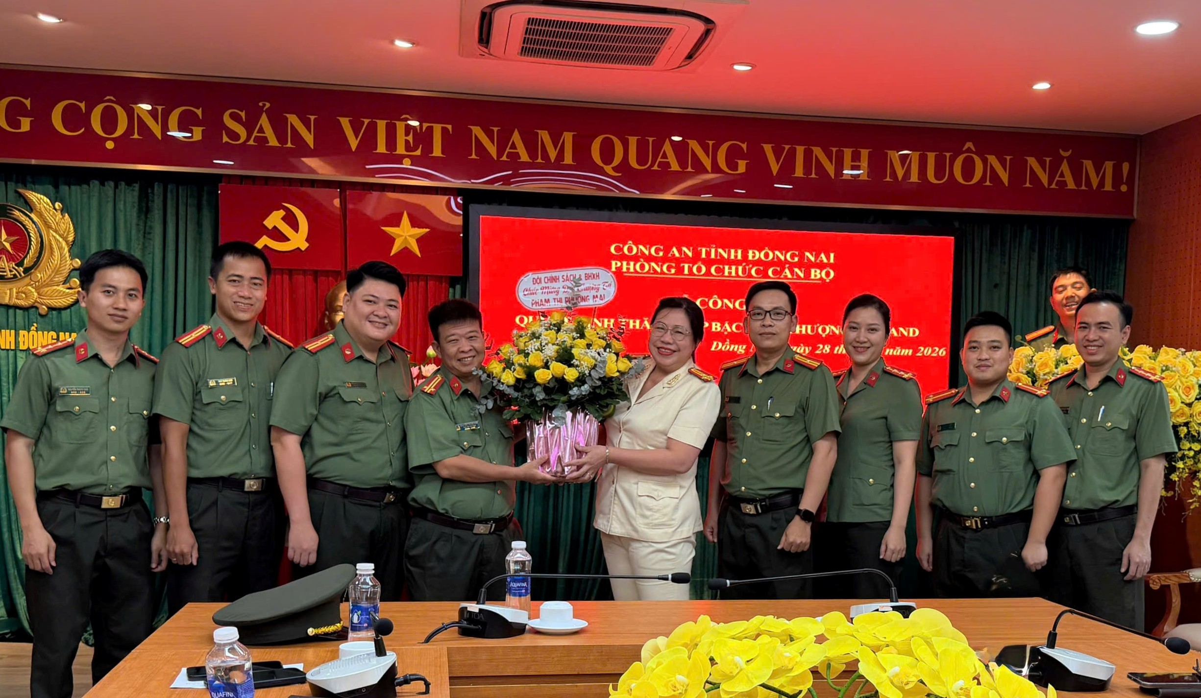 Trong không khí trang trọng, đồng chí Thượng tá Trần Anh Chiến - Phó Trưởng Phòng Tổ chức cán bộ, chủ trì buổi Lễ, đã trao quyết định, tặng hoa chúc mừng hai đồng chí được thăng cấp bậc hàm. Các đồng chí, đồng đội cũng đã gửi tặng những bó hoa tươi thắm, thể hiện sự trân trọng và niềm vui chung đối với thành tích đạt được.