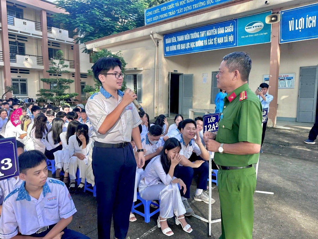 Nội dung về phòng, chống mua bán người được minh họa bằng nhiều câu chuyện thực tế, giúp học sinh hiểu rõ nguy cơ bị dụ dỗ qua mạng xã hội, thủ đoạn giả danh “tuyển việc, du học, kết bạn” để lừa bán người. Đặc biệt, chuyên đề phòng chống bạo lực học đường được truyền đạt sinh động thông qua các tình huống và phần thảo luận trực tiếp. Các em học sinh được hướng dẫn kỹ năng kiềm chế cảm xúc, ứng xử văn minh và báo cáo kịp thời khi phát hiện hành vi bạo lực.