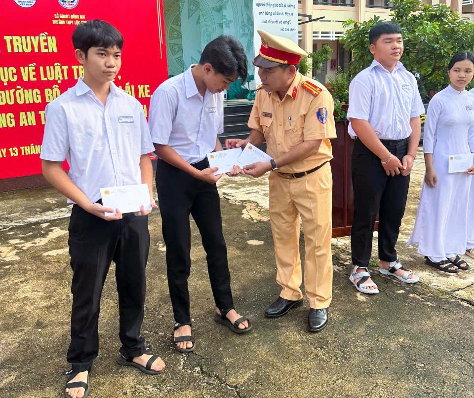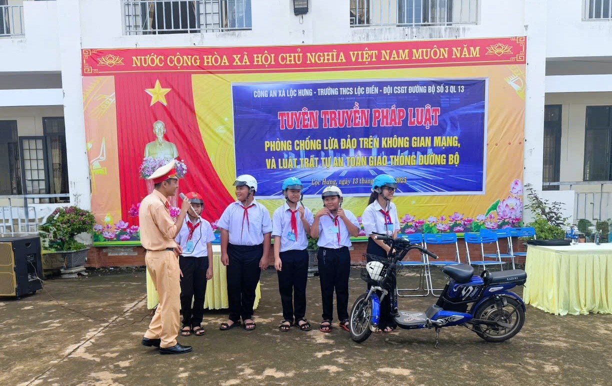 Cùng ngày, Đội CSGT đường bộ số 3 phối hợp với Trường THPT Lộc Ninh và Trường THCS Lộc Điền tổ chức tuyên truyền cho 2.230 học sinh và giáo viên nhà trường. Dịp này, đơn vị đã trao tặng 5 suất học bổng trị giá 5 triệu đồng cho học sinh vượt khó, tặng 16 mũ bảo hiểm, hướng dẫn kỹ năng lái xe an toàn và cho học sinh ký cam kết chấp hành Luật TTATGT đường bộ năm học 2025-2026.