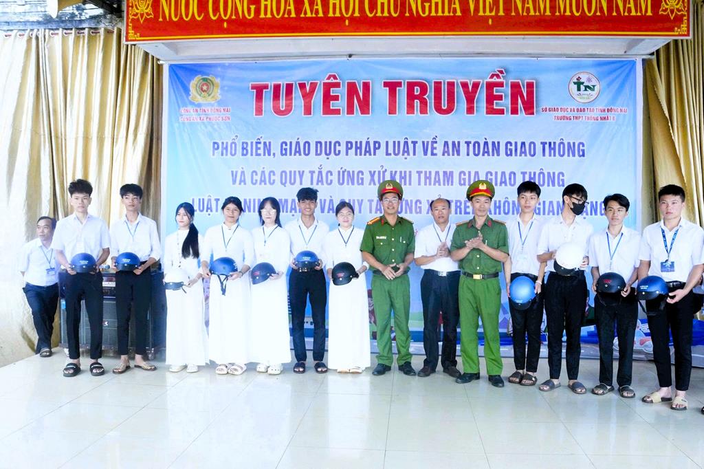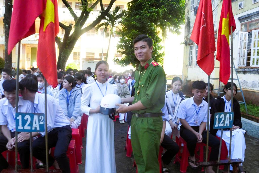 Công an xã trao tặng nón bảo hiểm cho các học sinh có thành tích học tập tốt và tích cực tham gia tuyên truyền pháp luật về An toàn giao thông
