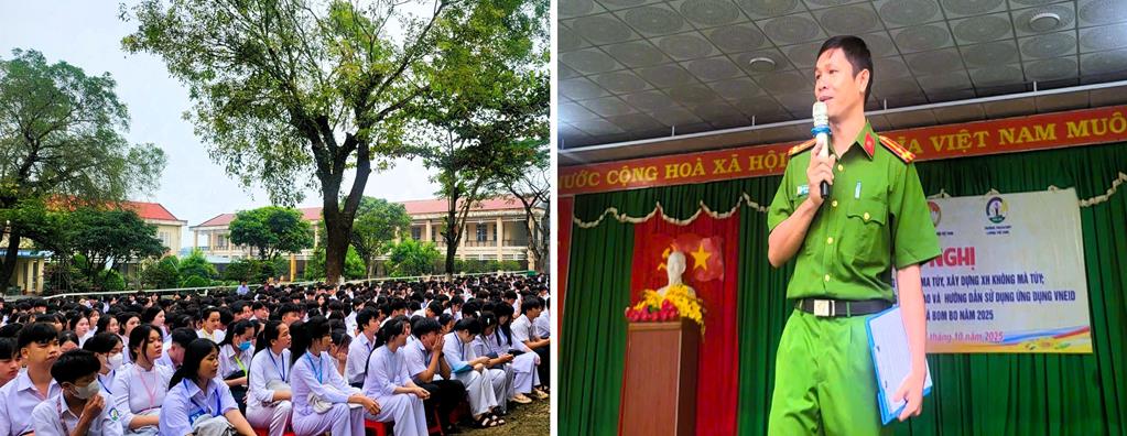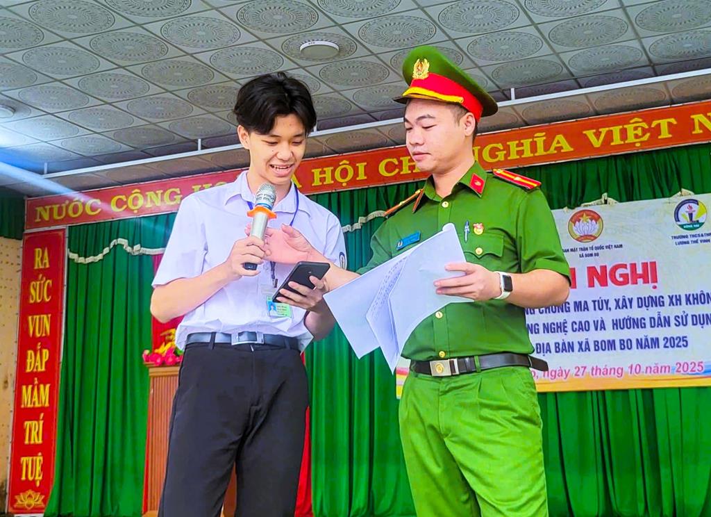 Tại buổi tuyên truyền, cán bộ Công an xã đã phổ biến các nội dung trọng tâm như: Hướng dẫn cài đặt, kích hoạt và sử dụng ứng dụng định dạnh điện tử VNeID phục vụ tra cứu, thực hiện các dịch vụ công; kỹ năng nhận biết, phòng tránh các hình thức lừa đảo qua mạng, bắt cóc online, tội phạm công nghệ cao đang có xu hướng gia tăng; đồng thời tuyên truyền về tác hại của ma túy, bạo lực học đường và các hành vi vi phạm pháp luật thường gặp trong lứa tuổi học sinh.