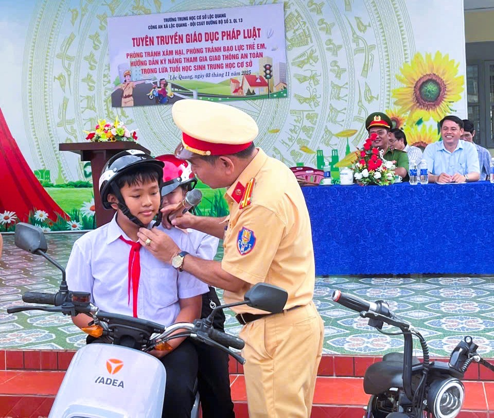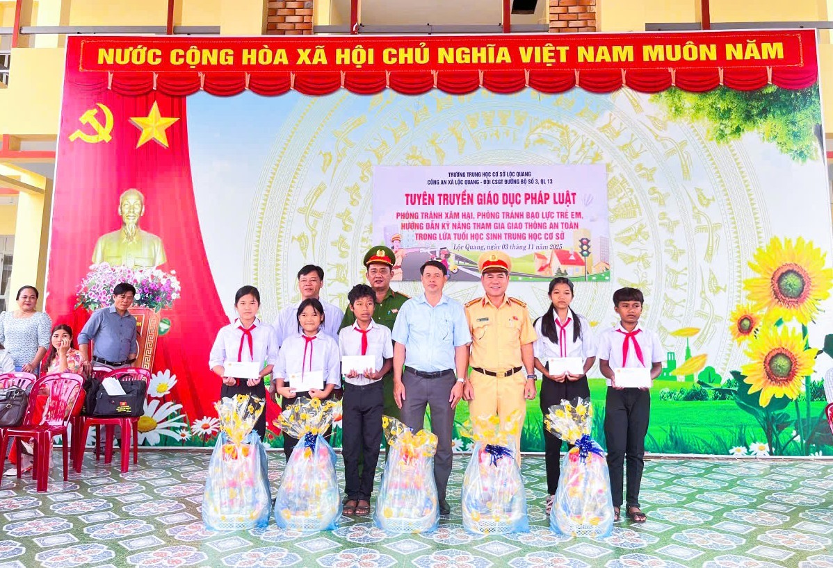 Cùng ngày, Đội CSGT đường bộ số 3 phối hợp Công an xã Lộc Quang và Trường THCS Lộc Quang tổ chức chương trình tuyên truyền cho 695 học sinh và 41 giáo viên. Bên cạnh nội dung tuyên truyền trực quan sinh động, đơn vị còn tặng 5 mũ bảo hiểm và 5 phần quà trị giá 3 triệu đồng nhằm khuyến khích học sinh thực hiện tốt các quy định khi tham gia giao thông.