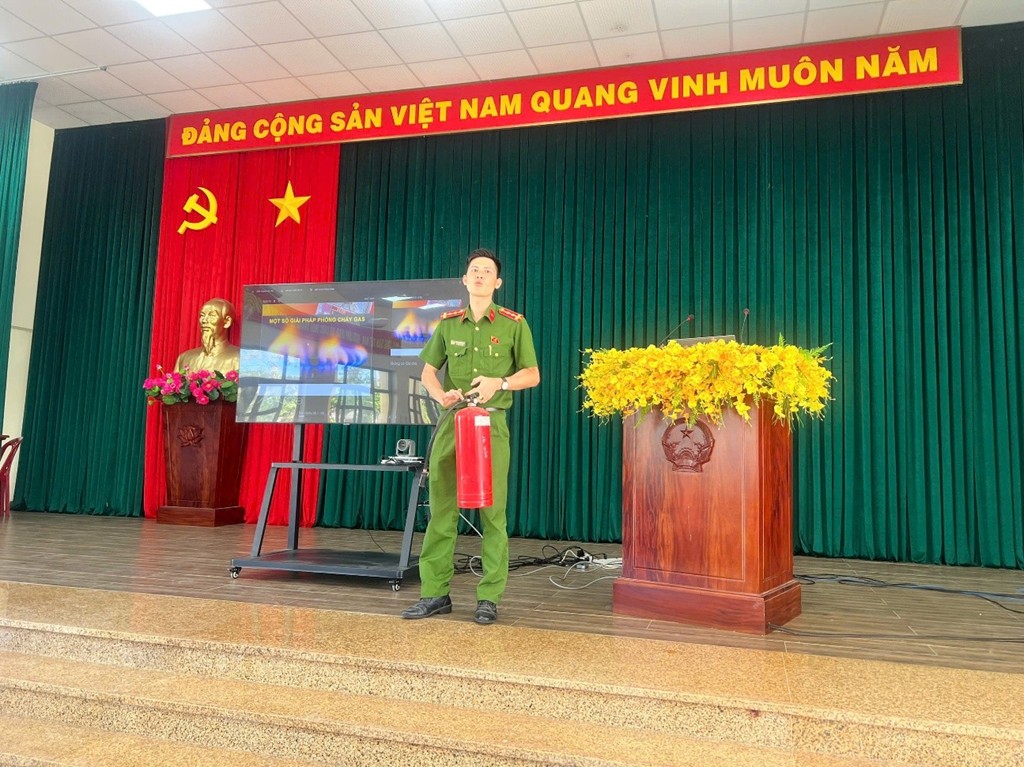 Cán bộ Phòng Cảnh sát PCCC & CNCH - Công an tỉnh tuyên truyền, hướng dẫn cách sử dụng bình chữa cháy