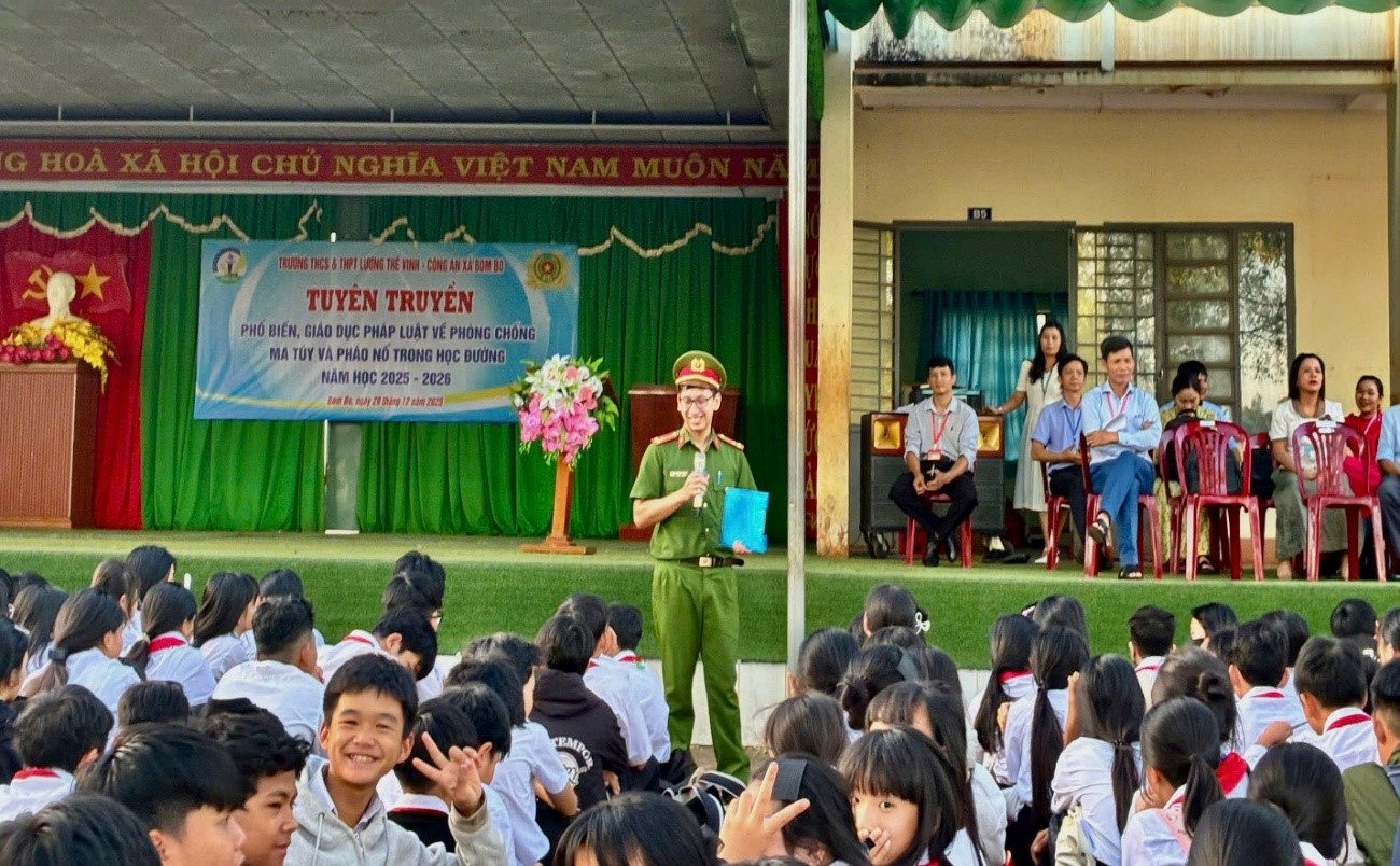 Ngày 29/12/2025, tại Trường THCS & THPT Lương Thế Vinh, Công an xã Bom Bo đã tổ chức thành công buổi tuyên truyền về phổ biến, giáo dục pháp luật về phòng, chống ma tuý và pháo nổ trong học đường cho toàn thể cán bộ, giáo viên và hơn 1000 học sinh nhà trường.