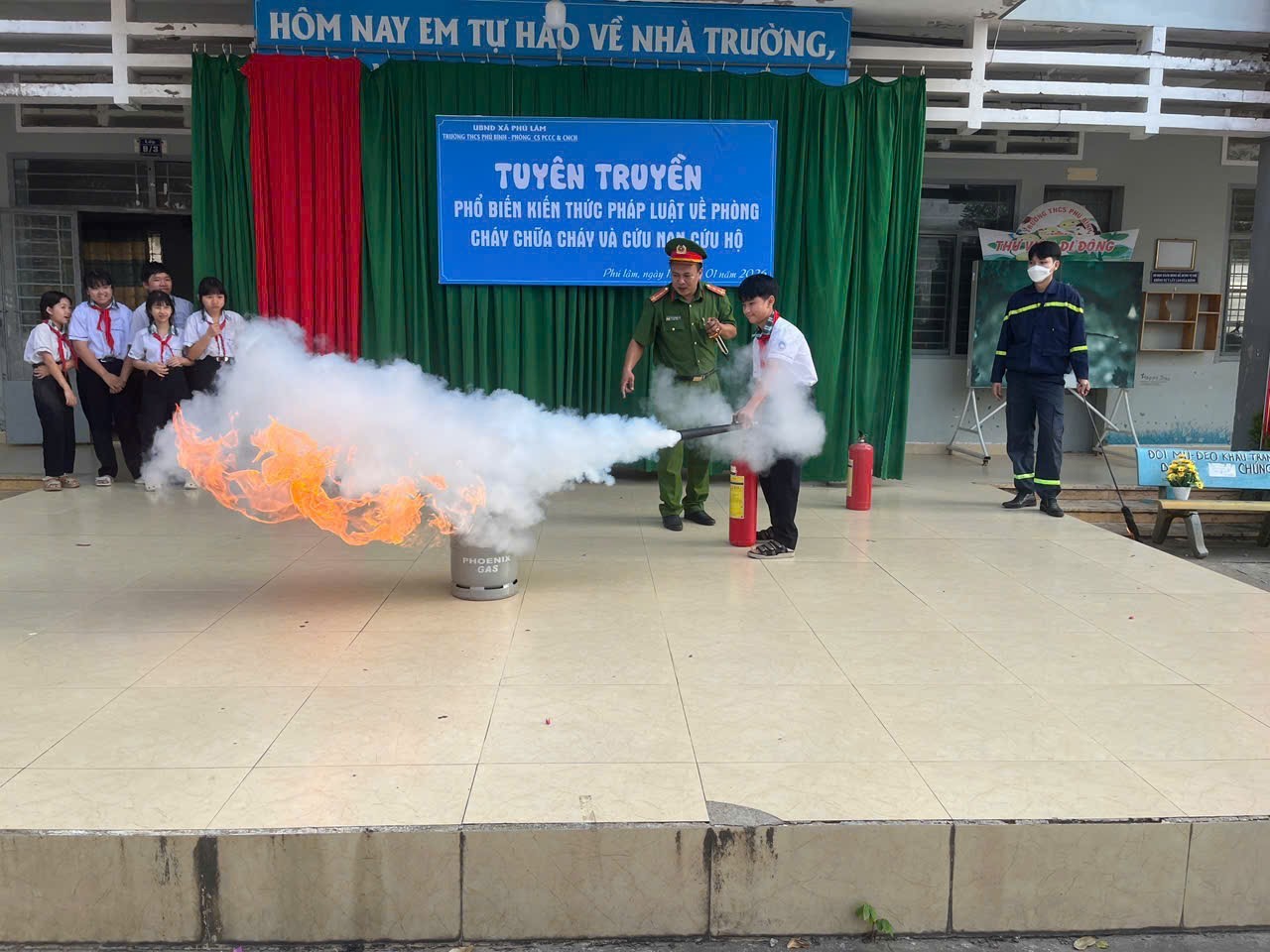 Các em học sính Trường THCS Phú Bình sử dụng bình chữa cháy dập tắt đám cháy do rò rỉ gas