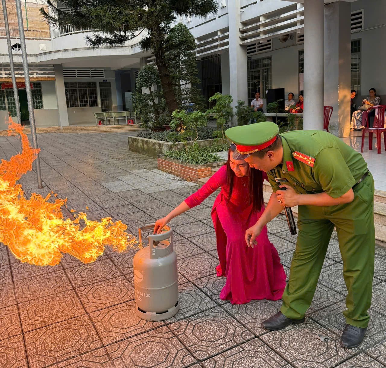 Không khí buổi tuyên truyền trở nên sôi nổi, hào hứng khi các giáo viên, các em học sinh được trực tiếp thực hành sử dụng bình chữa cháy để dập tắt đám cháy. Dưới sự hướng dẫn của cán bộ Đội CC&CNCH KV9 - Phòng Cảnh sát PCCC và CNCH, các giáo viên, các em học sinh lần lượt được cầm bình chữa cháy, rút chốt an toàn, giữ đúng tư thế, bóp cò, dập tắt đám cháy do rò rỉ khí gas.