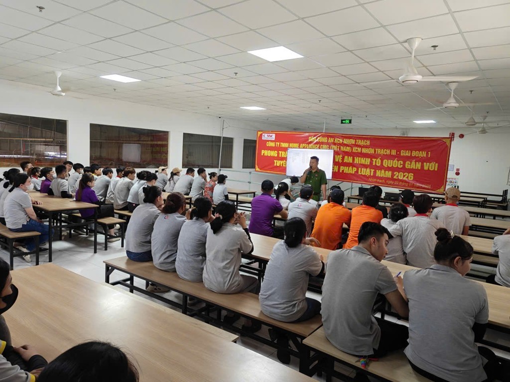 Ngày 22/01, Đồn Công an Khu công nghiệp (KCN) Nhơn Trạch, tỉnh Đồng Nai đã tổ chức buổi tuyên truyền, phổ biến pháp luật về phòng, chống tội phạm hình sự, tội phạm sử dụng công nghệ cao và Luật Giao thông đường bộ cho cán bộ, công nhân, người lao động tại Công ty TNHH Home Appliance CMC Việt Nam, KCN Nhơn Trạch 3.
