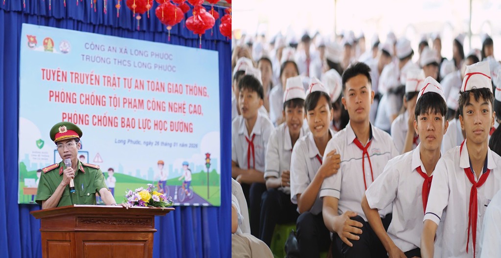 Buổi tuyên truyền thu hút sự tham gia của khoảng 1.000 cán bộ, giáo viên và học sinh. Tại chương trình, cán bộ Công an xã Long Phước đã trực tiếp phổ biến những nội dung cơ bản, thiết thực về việc chấp hành các quy định của pháp luật trong lĩnh vực trật tự an toàn giao thông; hướng dẫn nhận diện các phương thức, thủ đoạn phổ biến của tội phạm sử dụng công nghệ cao, đặc biệt là các hình thức lừa đảo trên không gian mạng; đồng thời tuyên truyền các biện pháp phòng ngừa, ngăn chặn tình trạng bạo lực học đường trong lứa tuổi học sinh.
