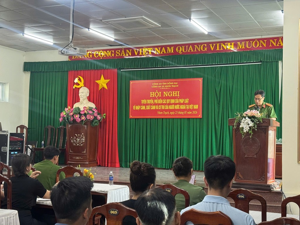 Công an xã Nhơn Trạch, tỉnh Đồng Nai vừa tổ chức buổi tuyên truyền, phổ biến pháp luật về nhập cảnh, xuất cảnh và cư trú của người nước ngoài tại Việt Nam cho khoảng 100 đại biểu là đại diện các doanh nghiệp, cơ sở sản xuất, kinh doanh và đơn vị có người nước ngoài đang sinh sống, làm việc trên địa bàn.