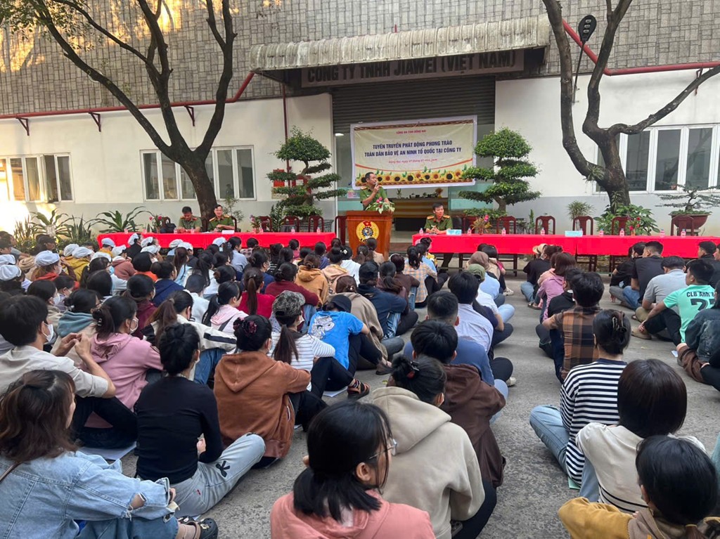 Nhằm nâng cao ý thức chấp hành pháp luật, tinh thần cảnh giác cho công nhân viên, người lao động, Phòng An ninh kinh tế Công an tỉnh Đồng Nai đã phối hợp với Phòng An ninh mạng, Phòng Cảnh sát hình sự, Phòng Tham mưu và Đồn Công an Khu công nghiệp Bắc Đồng Phú tổ chức buổi tuyên truyền pháp luật, phát động phong trào “Toàn dân bảo vệ an ninh Tổ quốc” tại Công ty TNHH Jiawei.