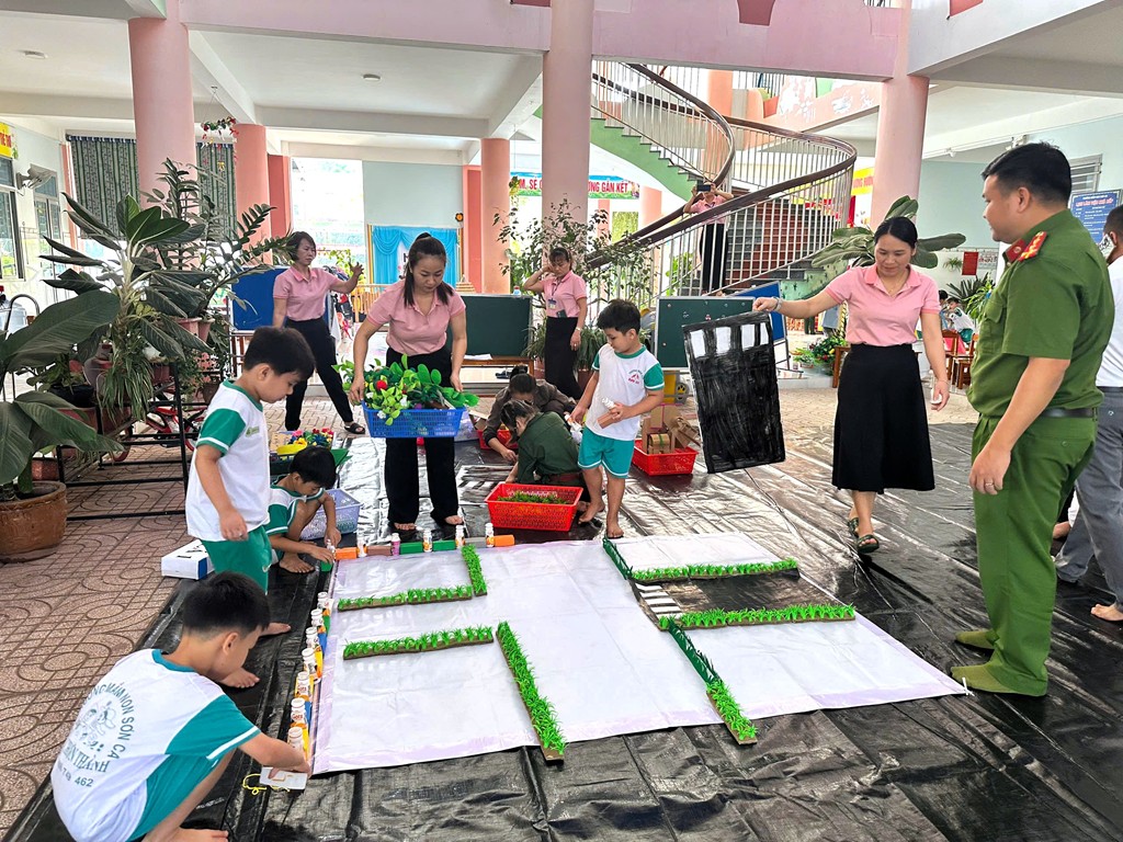 Cán bộ Công an phường cùng giáo viên nhà trường tham gia trò chơi trải nghiệm về chủ đề “An toàn giao thông” cùng các bé