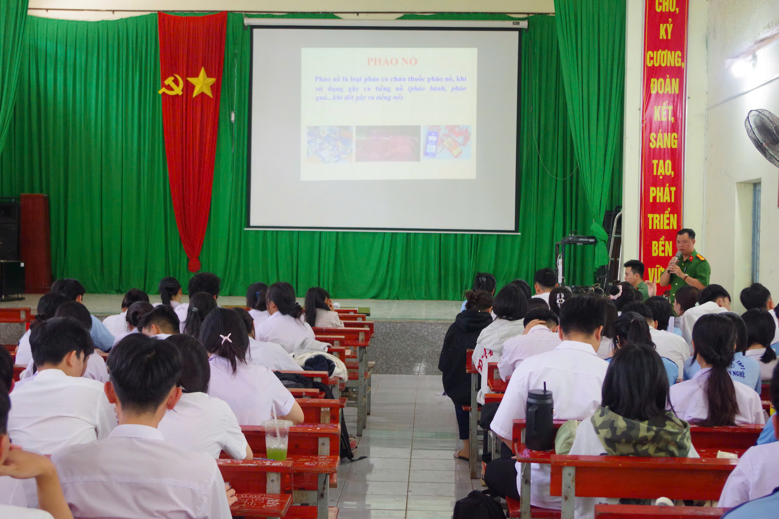 Tại Trường THCS – THPT Huỳnh Văn Nghệ, Công an xã phối hợp với Ban Giám hiệu nhà trường tổ chức 2 buổi tuyên truyền pháp luật cho gần 470 học sinh thuộc 4 lớp khối 12. Nội dung tuyên truyền tập trung vào kỹ năng tham gia giao thông an toàn và các quy định của pháp luật về quản lý, sử dụng pháo; đồng thời phân tích những hậu quả, tác hại của việc sử dụng pháo trái phép.